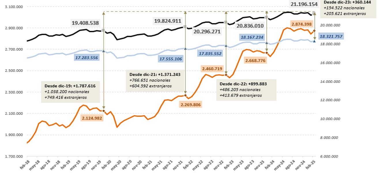 Se registra el número más alto del total de personas extranjeras que cotizan a la Seguridad Social tanto en la serie original como desestacionalizada de un mes de febrero.