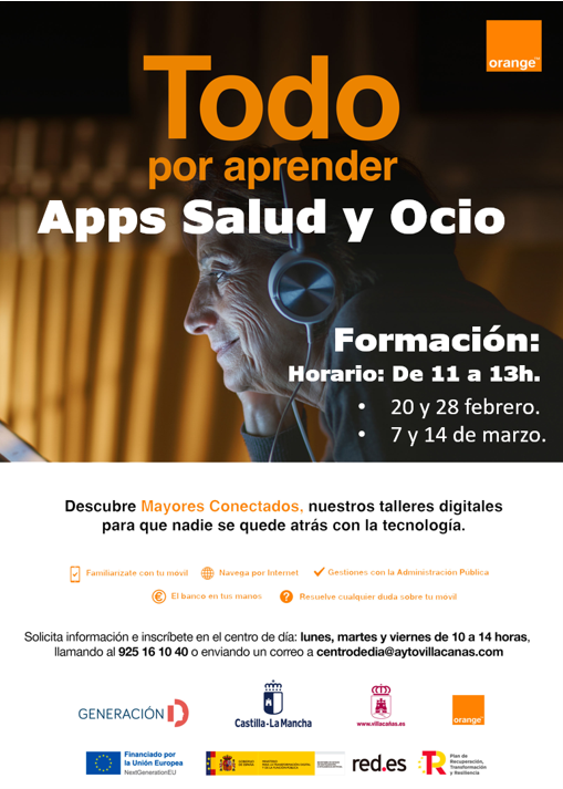El programa ‘Mayores conectados’ de Orange, a través del cual ya han mejorado las competencias digitales de cerca de 10.000 personas mayores de 65 años en toda España, llega a Villacañas esta semana con el taller “Apps Salud y Ocio” que se desarrollará en cuatro sesiones entre los meses de febrero y marzo.