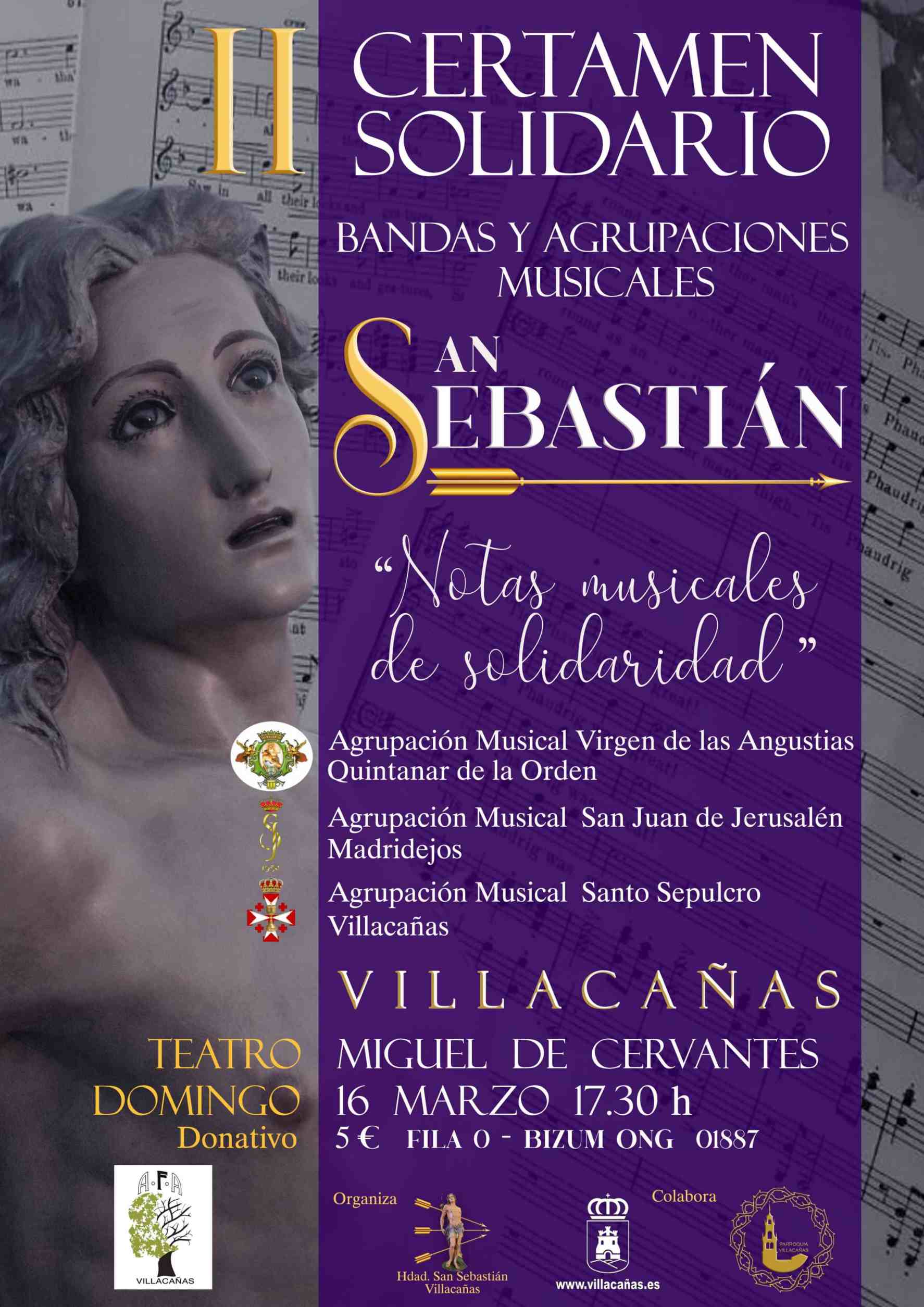 La Hermandad de San Sebastián Mártir, Protectora Santa Bárbara y Beato Carlo Acutis, en colaboración con el Ayuntamiento y el Consejo de Hermandades y Cofradías de Villacañas, celebrará el próximo domingo 16 de marzo, la segunda edición del Certamen Solidario de Bandas y Agrupaciones Musicales “San Sebastián”.