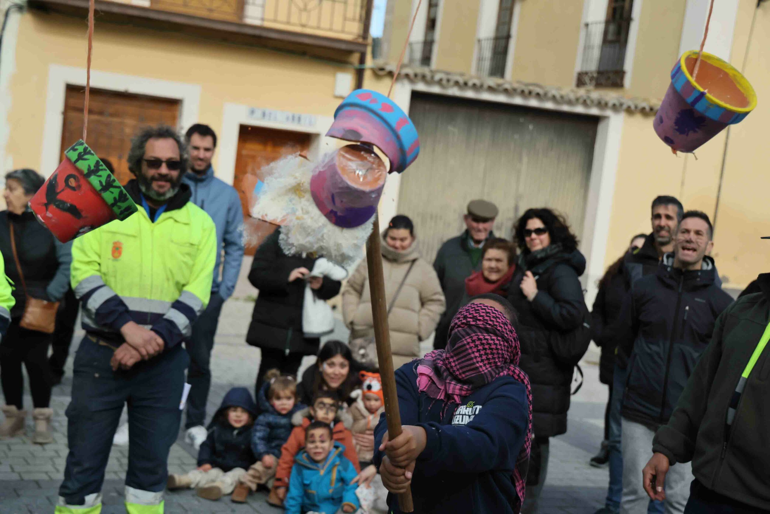 Después de relamerse de los labios el dulzor del chocolate, los más pequeños, con los ojos atentos y las manos inquietas, se colocaron bajo una de las dos sogas, concretamente de la que pendían los globos rellenos de confeti y decorados con motivos carnavaleros. Los mayores aguardaban su turno ante la otra gran soga, tendida desde la fuente hasta el palacio, de la que este año colgaban macetas decoradas en el aula, herederas de aquellos antiguos botijos. Con los ojos vendados y después de dar tres vueltas sobre sí mismos, los niños intentaban pincharlos, y romperlas, guiados por las voces del público. Al estallar, la harina, el confeti y el arroz se dispersaban en el aire frío de la mañana entre aplausos y risas.