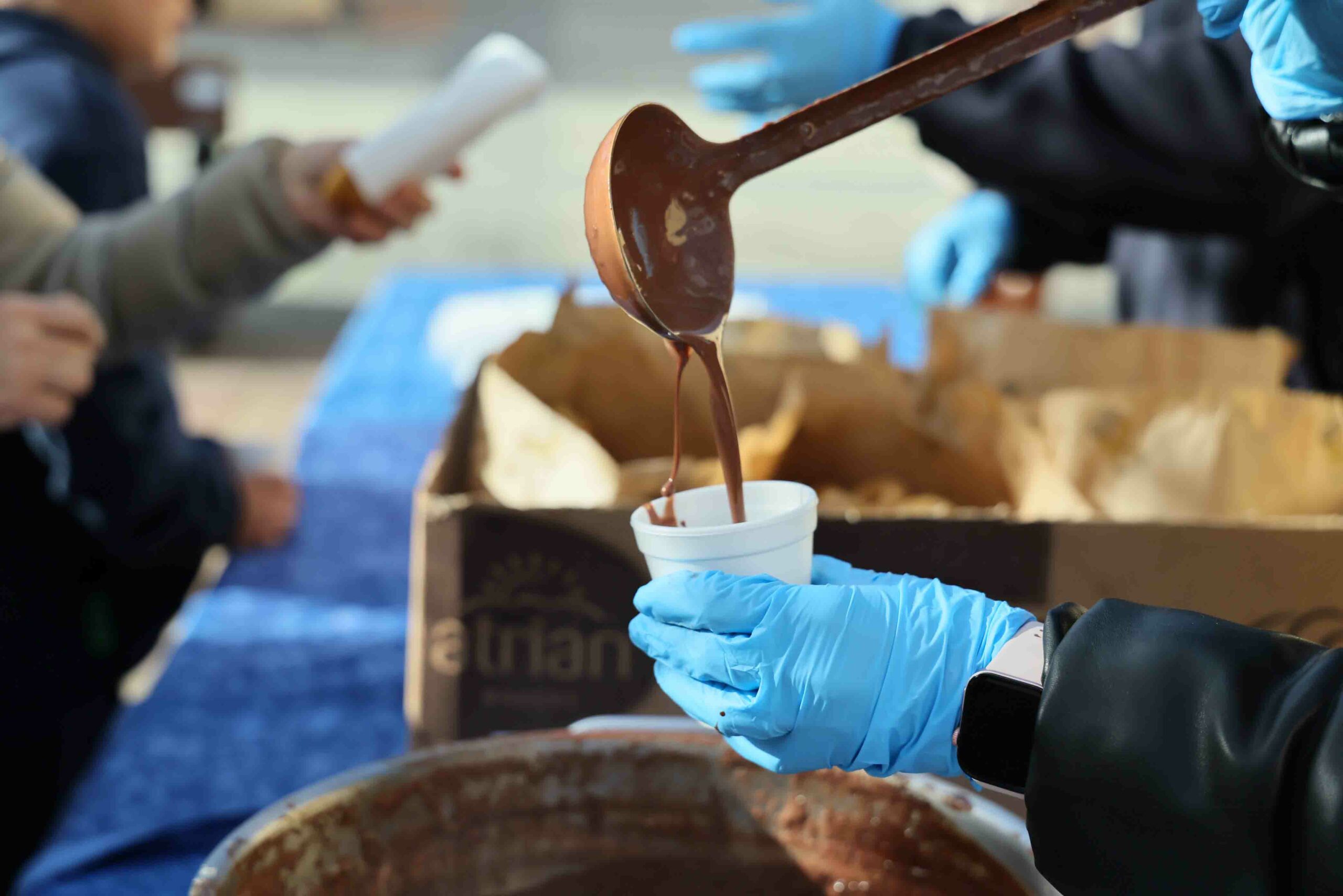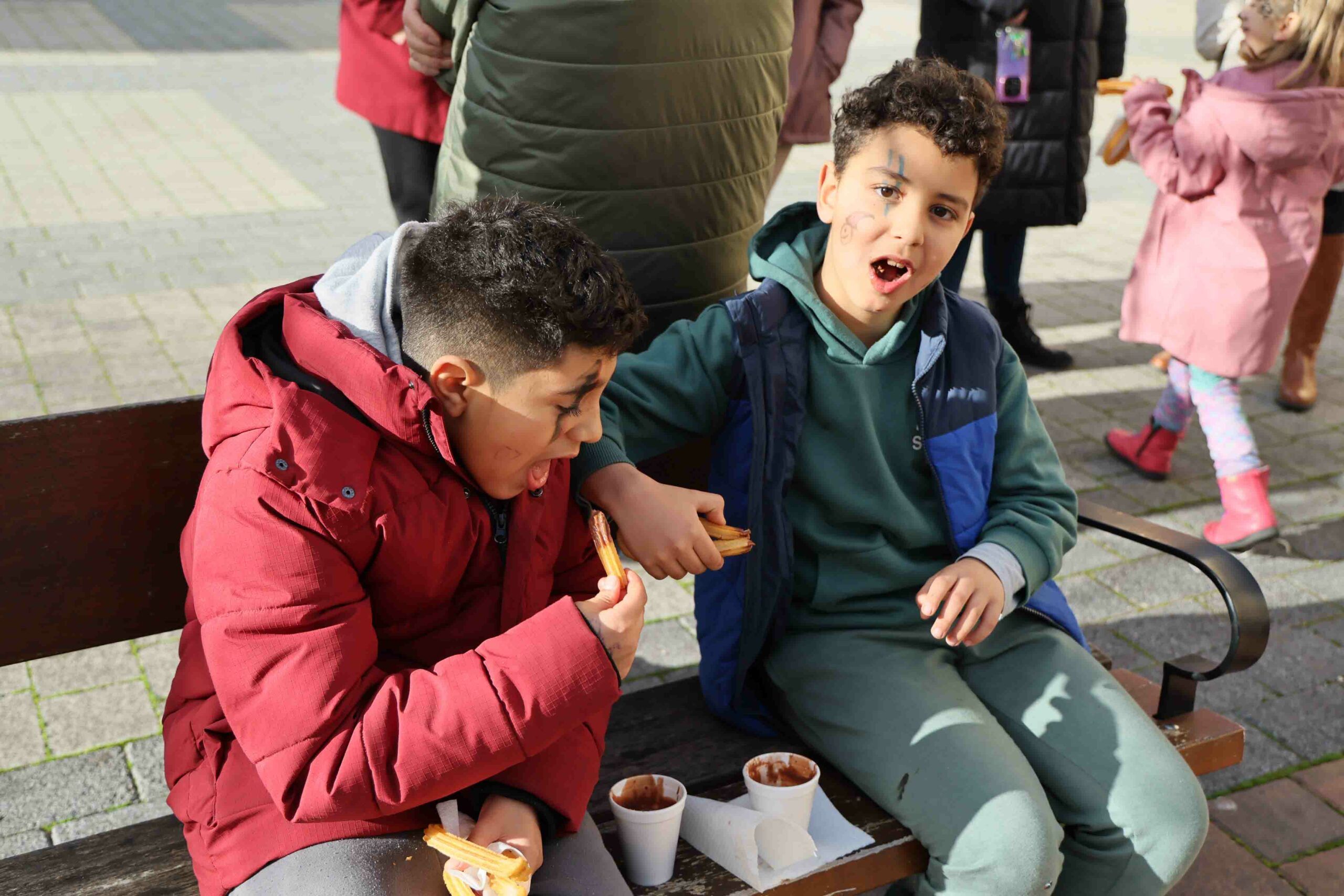La propia Claudia Buendía, que creció rompiendo pucheros en esta misma plaza, compartió su vivencia. “Es una tradición de toda la vida, yo los preparaba en el cole con mis abuelos y veníamos con los amigos a romperlos, antes hacíamos botijos y les metíamos harina, arroz, agua o alguna moneda para que hubiera más sorpresa”, contaba. Ahora, desde el otro lado, sigue implicada. “Hoy hemos hecho el chocolate para todo el pueblo y es una maravilla ver a los niños esperar su turno para colgar y romper los pucheros, luego llega la tortilla con chorizo y los dulces y se junta toda la familia”, explicaba.
