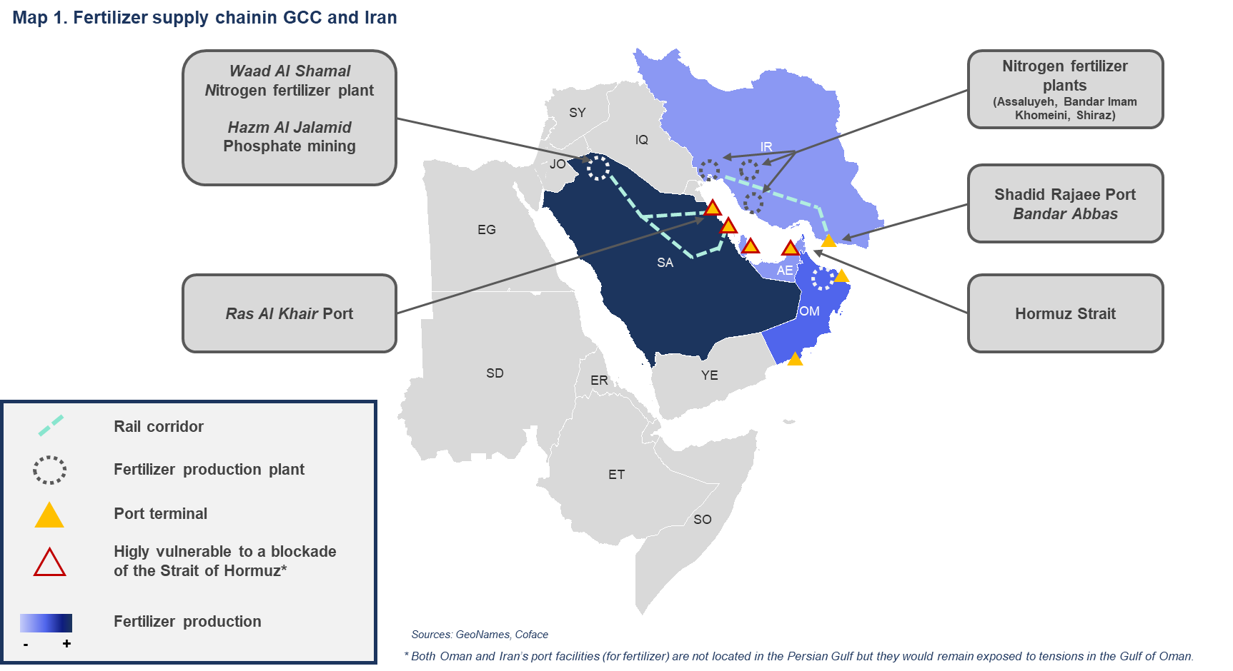 Gracias al abaratamiento de los suministros energéticos nacionales, los países del Golfo ocupan una posición central en estos mercados, representando casi el 19 % de las exportaciones mundiales de fertilizantes nitrogenados y el 36 % del volumen mundial de urea, mientras que Arabia Saudí es el cuarto mayor exportador de fosfatos (Mapa 1). Sin embargo, el gas natural representa hasta el 80 % de los costes de producción de los fertilizantes nitrogenados. Por lo tanto, el aumento de los precios del gas provoca, automáticamente, un incremento de los precios de los fertilizantes: el precio de una tonelada de urea granulada (FOB Oriente Medio) ha subido un 37 %, hasta los 665 dólares, desde el inicio del conflicto.