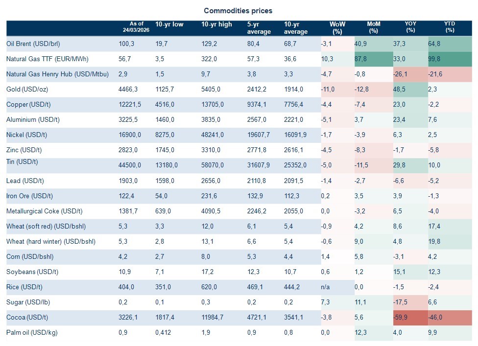En comparación, el mercado estadounidense parece menos expuesto a las interrupciones del suministro. No obstante, el Henry Hub estadounidense se encuentra bajo una fuerte presión alcista (+36 % intermensual), una señal de que las tensiones energéticas ya se han extendido a nivel mundial.