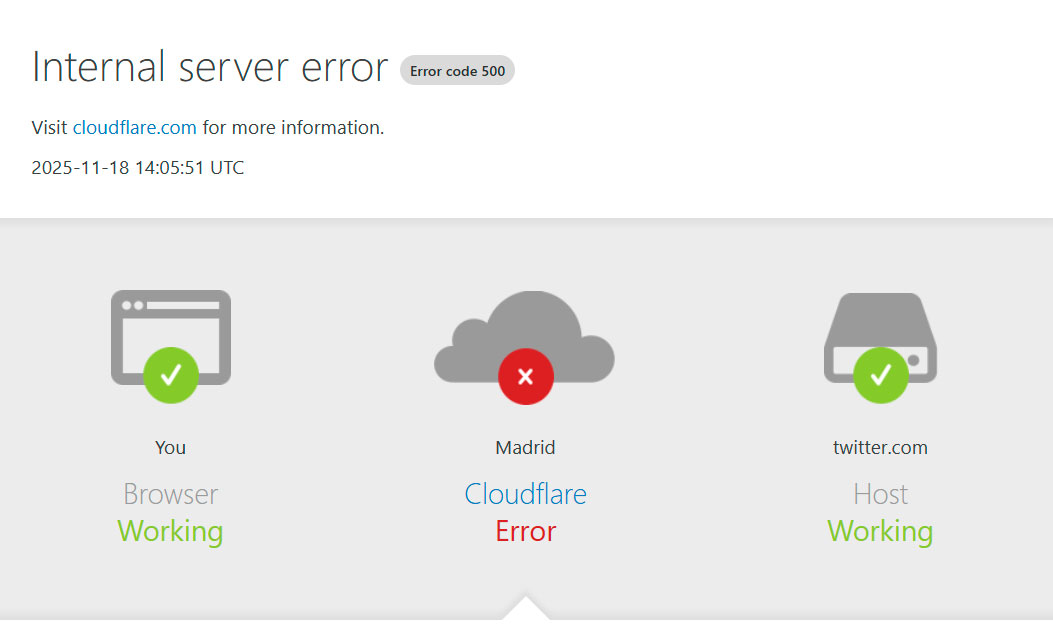 Hoy 18 de noviembre está teniendo lugar una interrupción masiva de la red global de Cloudflare provocando incidencias en distintos servicios a escala mundial. Fue alrededor de las 11:48 UTC, cuando tuvo lugar este suceso que provocó fallas en cadena en plataformas como X, ChatGPT, Canva entre otros.