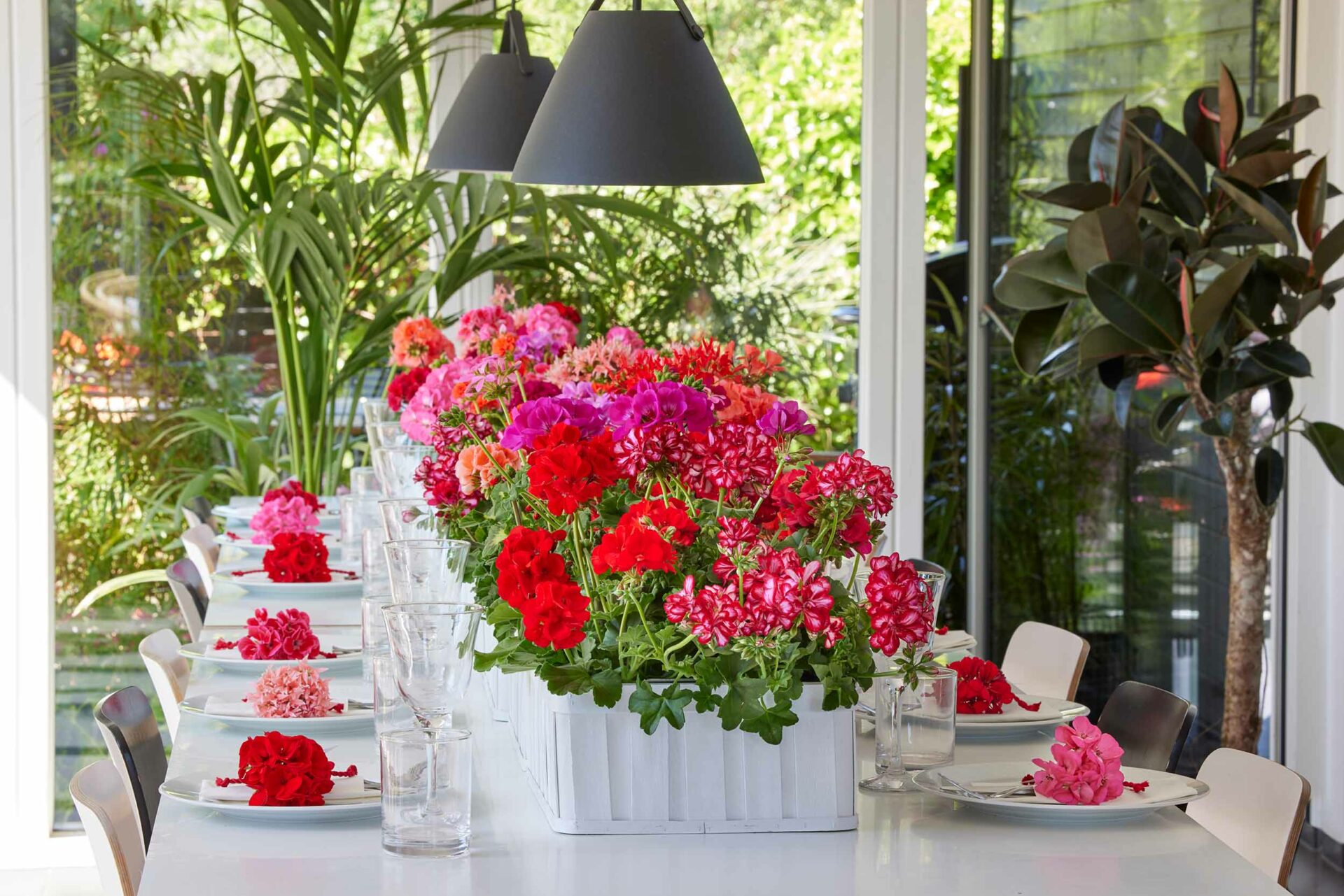 En primer lugar, los expertos de PfE explican que una apuesta segura es incorporar macetas repletas de geranios en medio de las mesas. Una de las propuestas que sugieren los profesionales es disponer de una mesa rectangular donde los invitados se sienten frente a frente, fomentando así la conversación y el ambiente cálido. A lo largo del centro de la mesa, se pueden colocar macetas con geranios en tonos vibrantes como rojo, rosa, naranja, entre otros, creando un corredor floral que aportará frescura y color al encuentro.