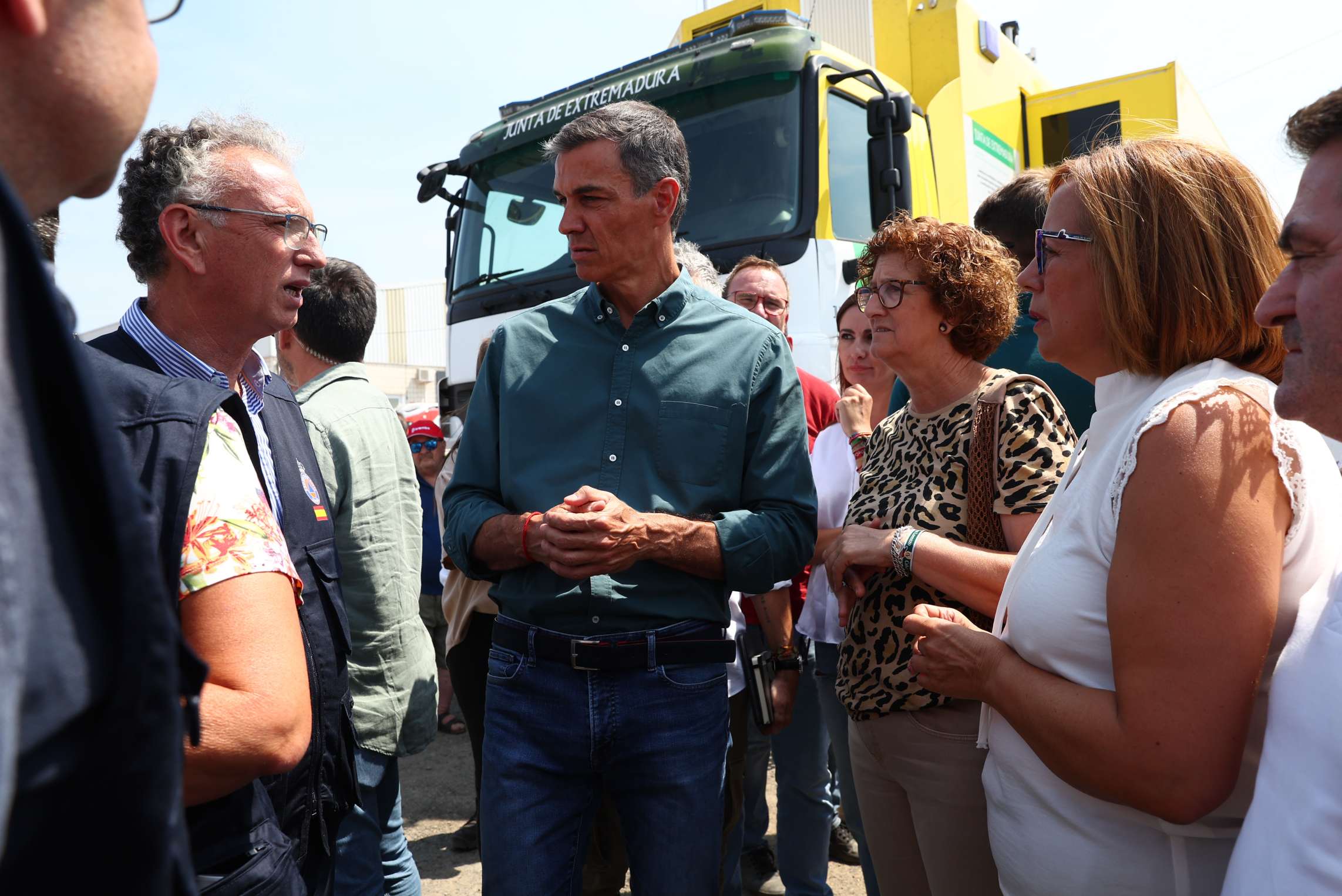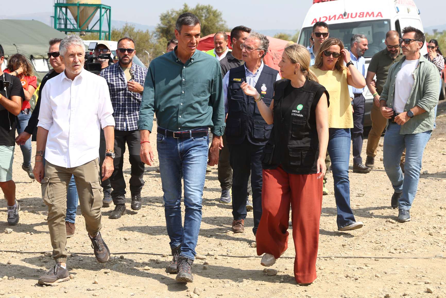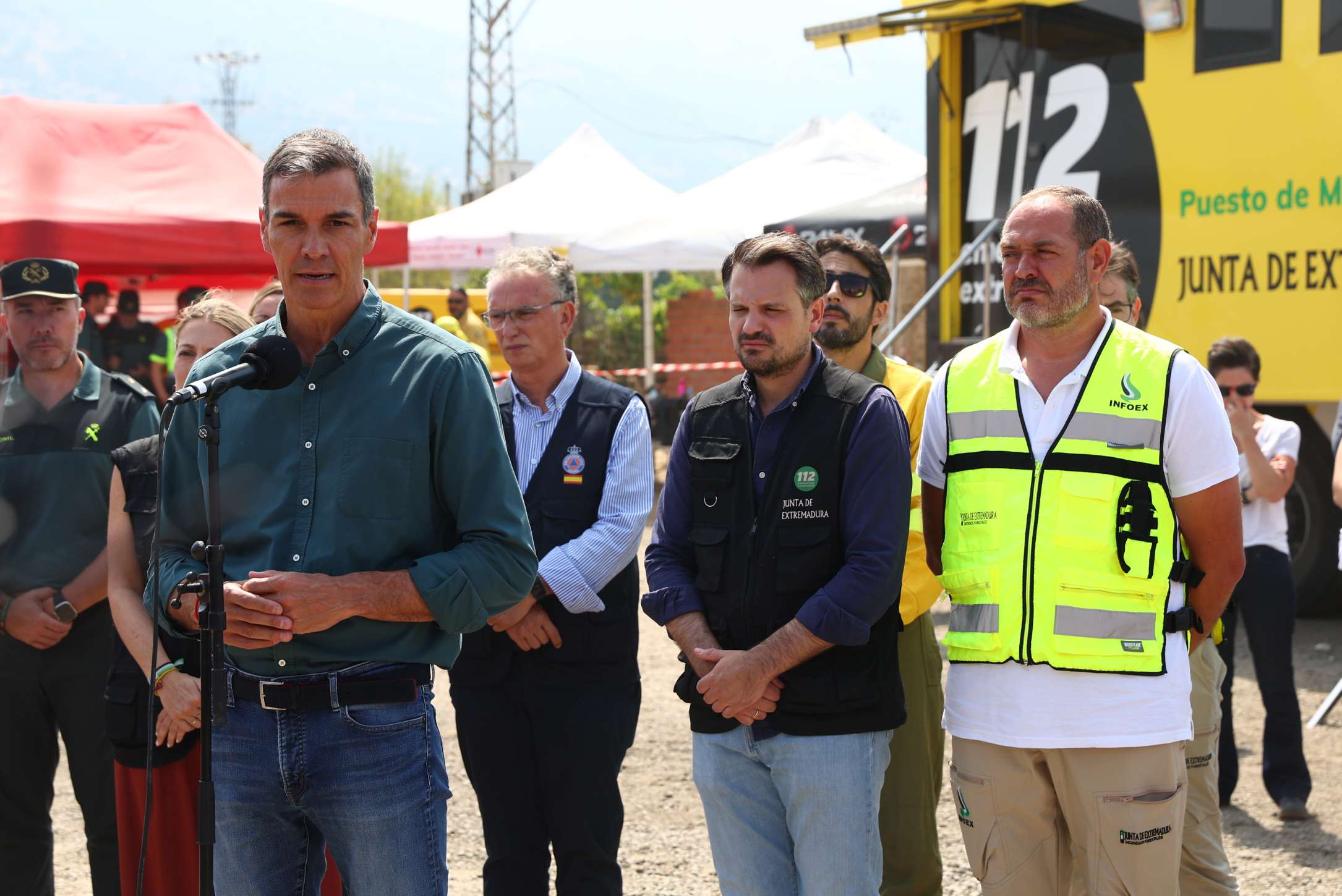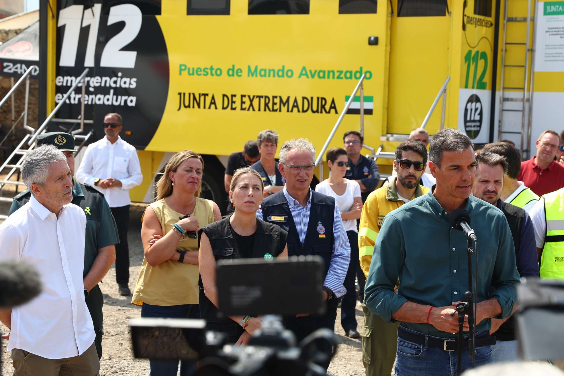 Desde el Puesto de Mando Avanzado de La Granja, en Cáceres, y acompañado de la presidenta de la Junta de Extremadura, María Guardiola; del ministro del Interior, Fernando Grande-Marlaska, y del delegado del Gobierno en Extremadura, José Luis Quintana, el jefe del Ejecutivo ha insistió en que “el sistema de Protección Civil y el Gobierno de España han estado desde el primer momento a disposición de la Junta de Extremadura para afrontar esta tragedia”,