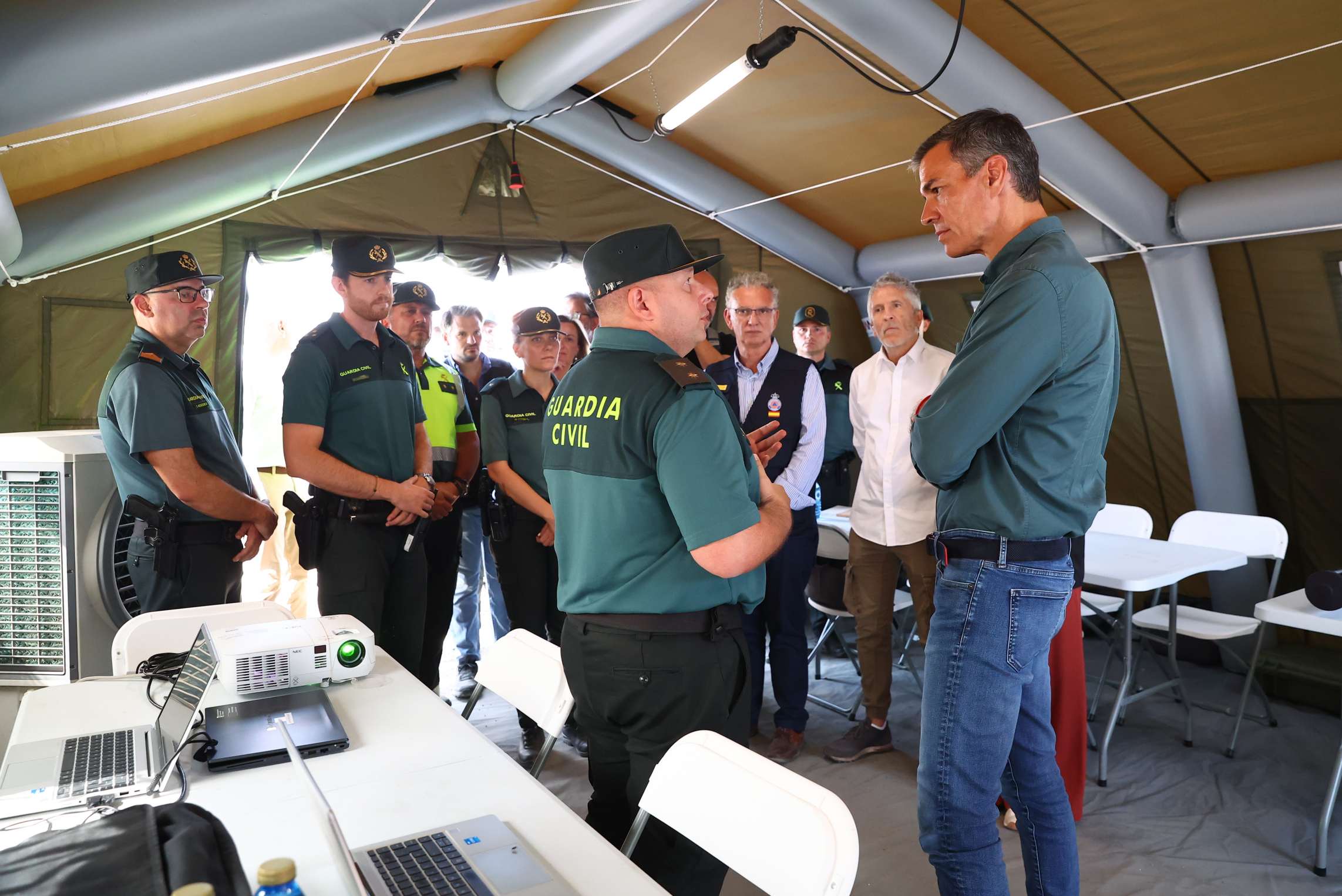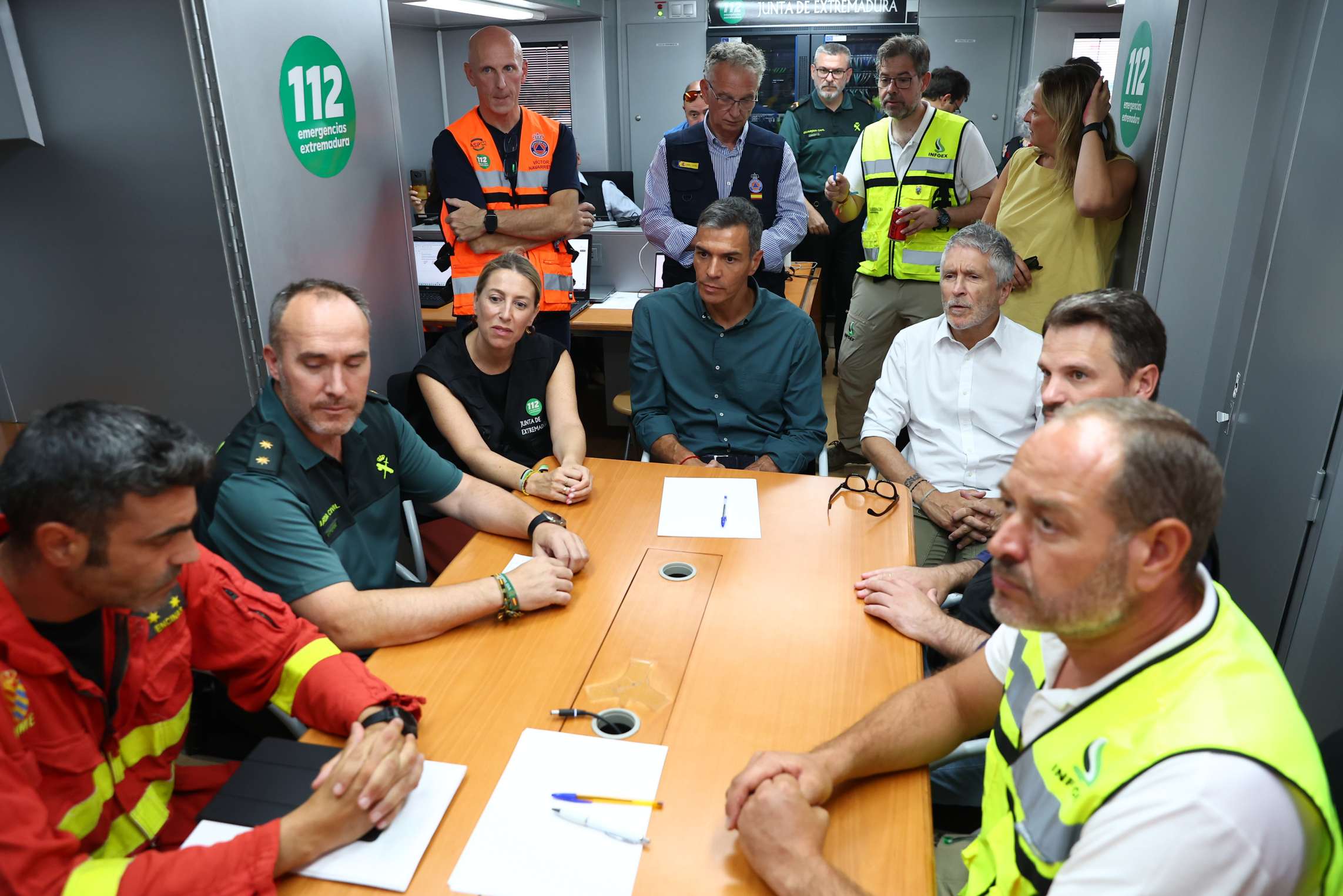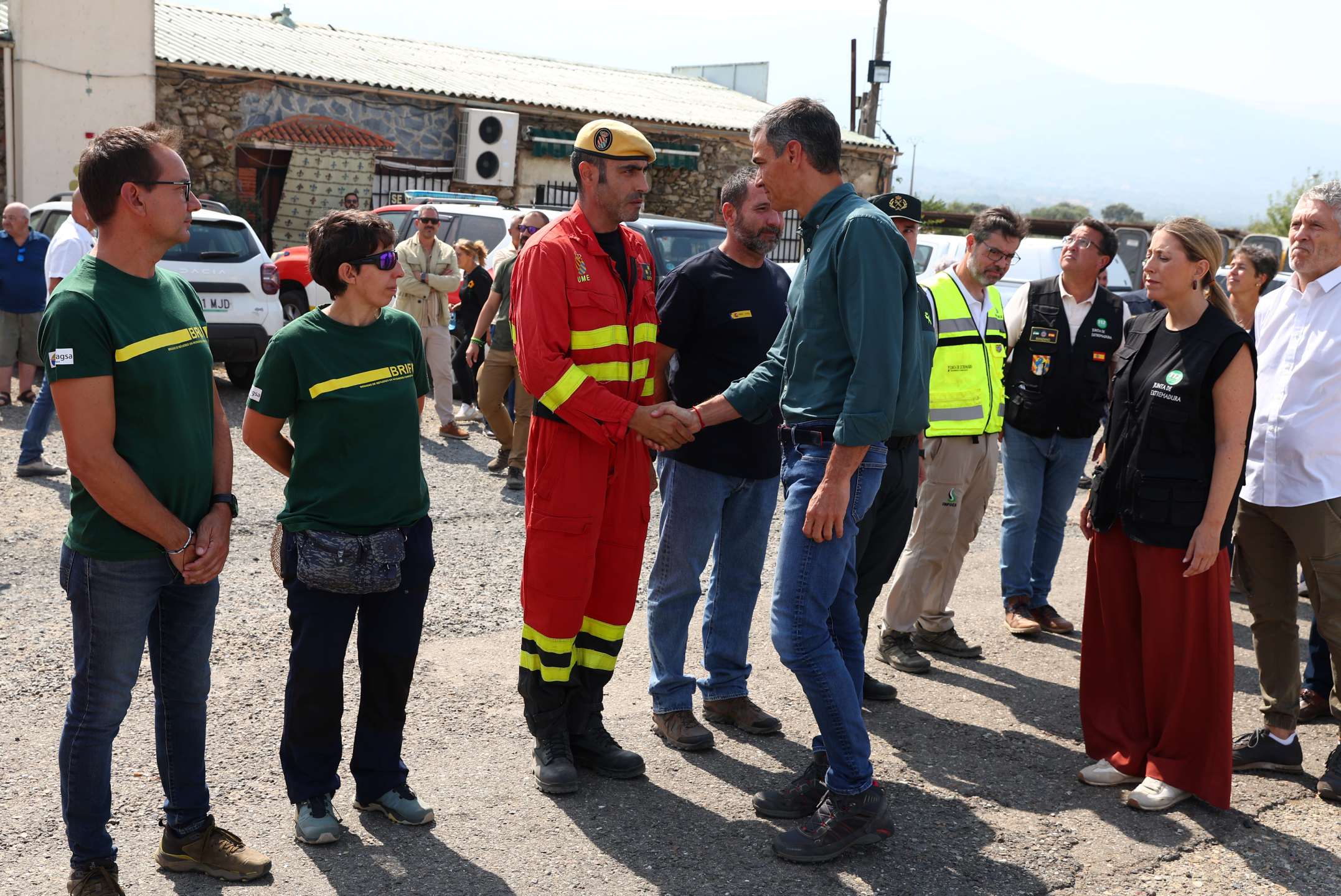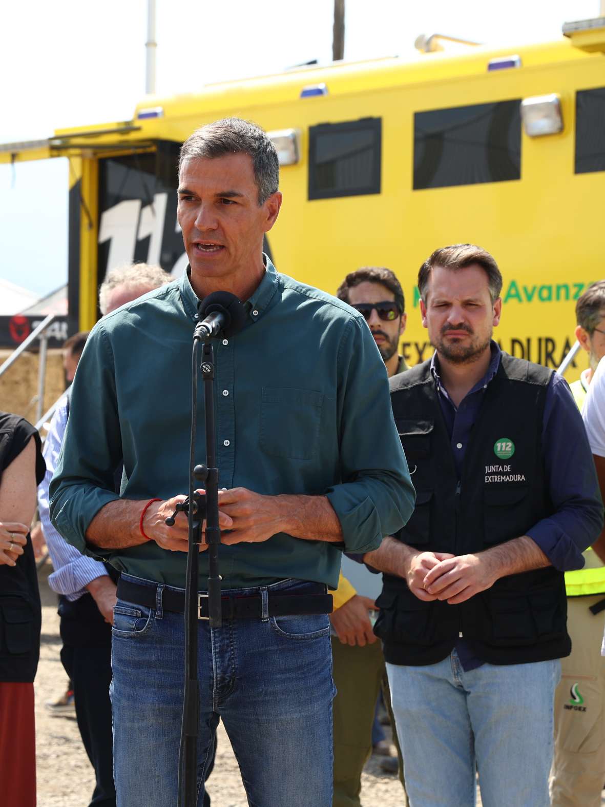 Desde el Puesto de Mando Avanzado de La Granja, en Cáceres, y acompañado de la presidenta de la Junta de Extremadura, María Guardiola; del ministro del Interior, Fernando Grande-Marlaska, y del delegado del Gobierno en Extremadura, José Luis Quintana, el jefe del Ejecutivo ha insistió en que “el sistema de Protección Civil y el Gobierno de España han estado desde el primer momento a disposición de la Junta de Extremadura para afrontar esta tragedia”,