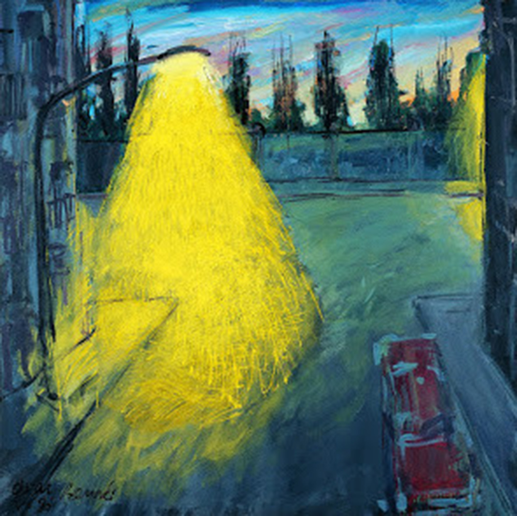 Por eso, nada mejor que, para terminar sobre esta advertencia, hacer alusión al excelente cuadro de mi paisano, Óscar García Benedí, titulado "Paisaje urbano desolador" y que esa solitaria farola que chorrea descaradamente rayos de luz nos ilumine.