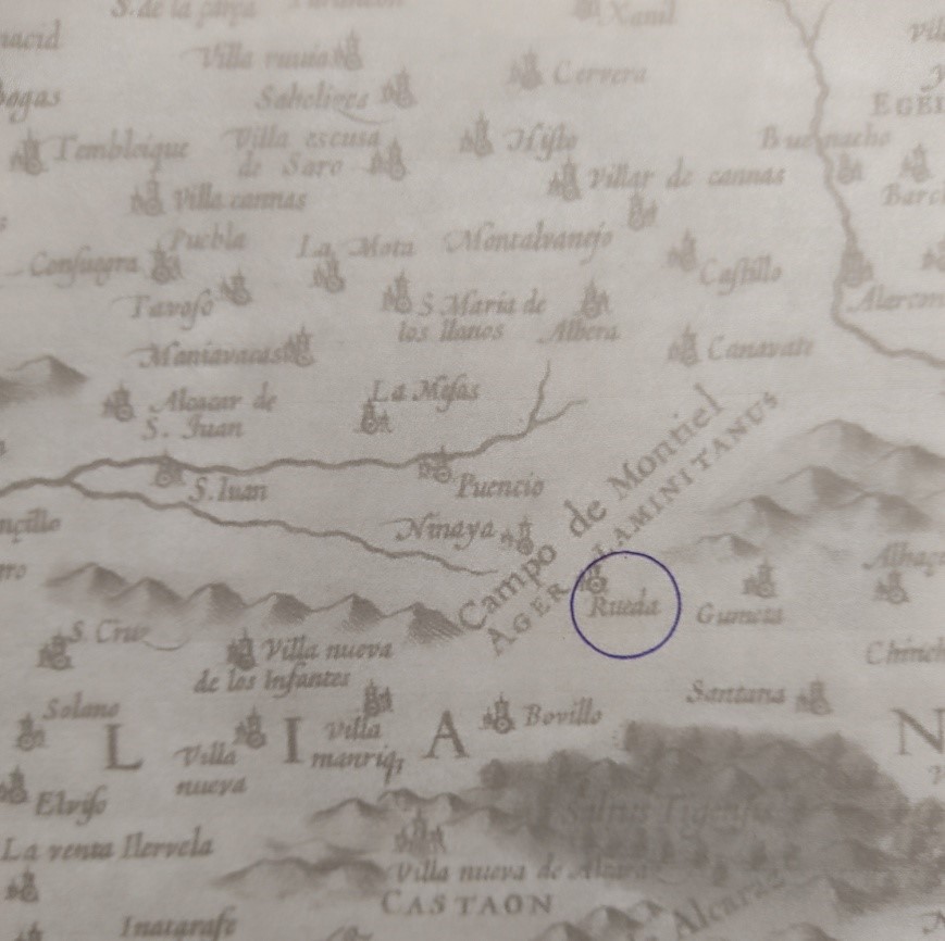 También creemos conveniente reseñar, los datos del Mercator aquél que, tras estudiar en la universidad de Lovaina, se dedicó a la fabricación de diversos instrumentos…, y tuvo relación con la corte de Carlos V. En Duisburgo instaló un taller de cartografía, en 1552; trabajando desde 1564, como cosmógrafo oficial del duque de Julich, Ceres y Berg. Elaboró mapas de Flandes, Gran Bretaña, Tierra Santa, Europa; un atlas moderno, globos terráqueos, esferas celestiales y en 1569, confeccionó un Mapamundi. Si bien, en los mapas, se suelen “enredar” la lengua vulgar y el latín. En lo correspondiente al Campo de Montiel=”AGER LAMINITANUS”, RUIDERA aparece con el nombre de “Rueda”.