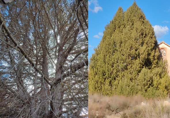 En el contexto orográfico que rodea las Lagunas de Ruidera o Cuenca del Alto Guadiana, los encinares se encuentran bien representados, al haber transcurrido más de tres cuartos de siglo, desde aquellos antiguos clareos y carboneos. Hoy, la vegetación montana forma ya un dosel arbóreo característico de cualquier bosque montés. Entre formaciones mixtas de encinar-sabinar, destacan las comunidades de sabina albar, en los parajes aledaños de las lagunas La Nava, Escudero, Blanca, Conceja, Batana… En nuestros años de encandilados trota-ríos y trota-montes—cuando jugábamos con los dinosaurios— esta planta propia de estratos calizos, areniscos, “incultos”; en “pisos” montanos y sub-alpinos, de 800 a 1500 metros de altitud, en aquel lejano entonces, las localizábamos en: El Sabinar, Lizana, Navalcaballo, Las Salinas de Pinilla, El Bonillo, El Ballestero, El Robledo, Villahermosa, Cañamares…; creciendo también en simbiosis, con la encina y el roble Quercus faginea. Por allí, hurgando en los orígenes de la mortecina usura…, acompasando los sentimientos con la ilusión, aprendí a tasar, en su justo precio los fines de los “intereses creados”… En aquellos alejados tiempos, en el territorio de la aldea de Ruidera, sólo se conocía la famosa “Sabina del Paraguas”, inmersa en la finca “Los Llanillos”; a unos cuatro kilómetros al Este de la aldehuela. Las periferias y riberas de las lagunas bajas, incluidas paredes travertínicas, lechos tobazosos y vega, en la actualidad, están siendo colonizadas por multitud de ejemplares de sabina albar y matas de caducifolias, inexistentes en otros tiempos… Este árbol de sabina, se está desarrollado en un estrato basal compuesto por derrubios o desmoronamientos de tobazo (con algunos cascajos), cargados de fosilizaciones de vegetación higrófila, helofítica y terofítica, procedentes de la toba del contexto hidrogeológico de la cascada de “El Hundimiento”, junto al frontis oeste de la derruida central hidroeléctrica de “San Alberto”. La vistosa y original mata, de morfología cónica y exuberante frondosidad, está compuesta por cuatro pies de robustos y sanos fustes de más de veinte metros de altura y un enramado, de unos ocho metros de diámetro, en la base o “arranque”. La alzada de esta sabina es excepcional y por tanto atípica dentro de los parámetros comunes, respecto de la “talla” de la masa arbórea y de los mayores ejemplares del sabinar albar que, desde tiempos geo-biológicos remotísimos, se han venido “desplegando” en el territorio de la cabecera de la Cuenca del Alto Guadiana.