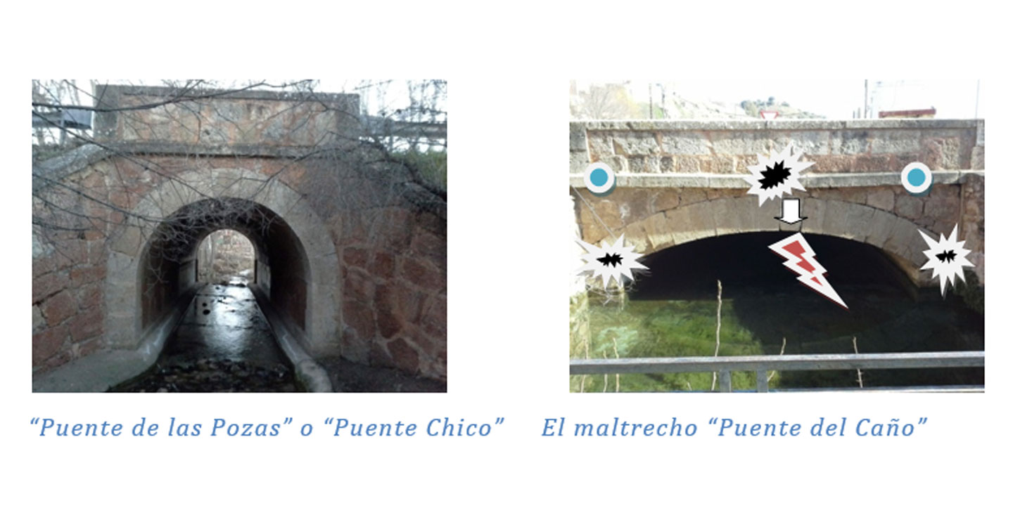 ”Puente del Caño”, con estallamientos en los sillares, por la presión que ejercen los vehículos de gran tonelaje, y arco Carpanel en la Fábrica de la Pólvora.