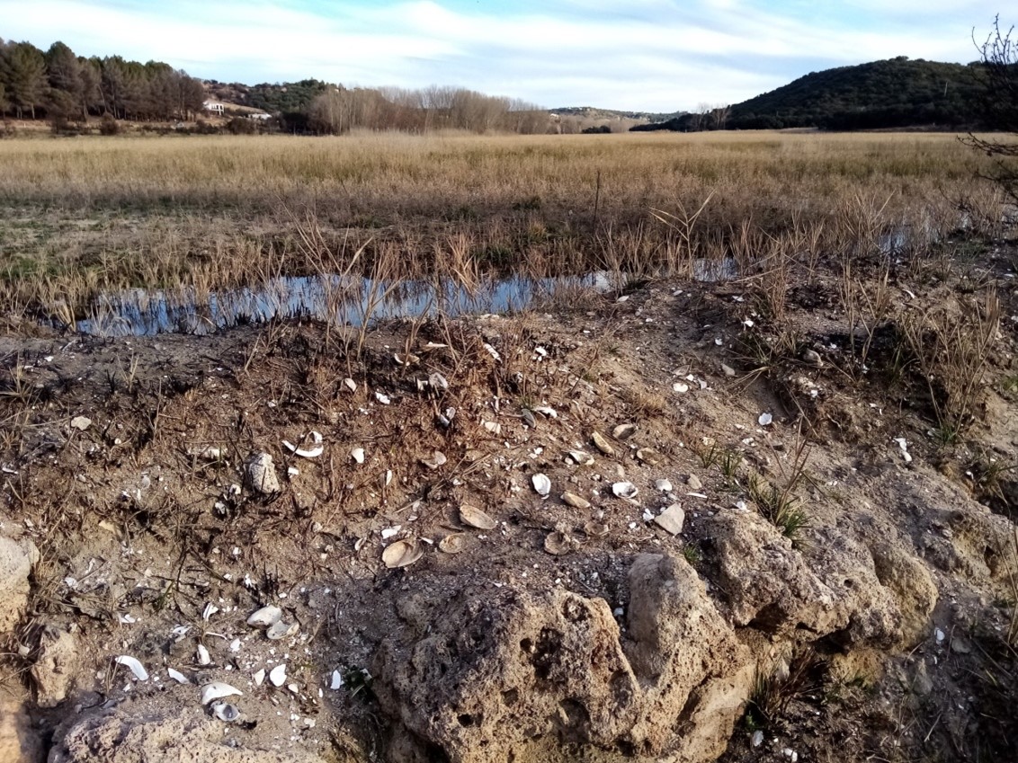 Los restos de conchas o “almejas de las lagunas”,— como se las denominaba en el lugar—pertenecen a moluscos bivalvos-náyades Unio pictorum, de morfología alargada que, debido al tiempo que han permanecido sin vida, presentan muy corroídas y deslustradas las rugosidades y relieves externos y también la lisura y brillo internos de las valvas. Las conchas de estos moluscos son puro carbonato cálcico cristalizado, con horma cristalina de aragonito. El brillo interior de estos bivalvos de agua dulce, se debe a dicho mineral, que suele cristalizar en sistema rómbico. Si bien, en las fosilizaciones de conchas, la calcita predomina sobre el aragonito. Estas náyades, han sido muy prolíficas en el Alto Guadiana-Lagunas de Ruidera; a través de los siglos, en “colaboración” con la fauna piscícola (parasitismo larvario); tanto en el desarrollo, a nivel de pequeños nichos ecológicos, como en el desplazamiento para colonizar nuevos hábitats. De la piscifauna autóctona de barbos, cachos, calandinos, bogas y otros, de hace décadas, que se ha venido desarrollando en equilibrio durante milenios, apenas si queda algún vestigio… En sedimentos fluviales, hoy desecados, pertenecientes a hábitats acuáticos extintos, se contabilizan hasta cuarenta reliquias de ejemplares de Unio pictorum por metro cuadrado.