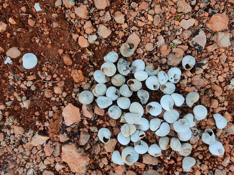 Las diversa especies de caracoles, la más conocida la del género Helix L., del orden de los pulmonados, familia de los helícidos ha sido común y abundante en toda la Península Ibérica. Y muy profuso también en las zonas umbrosas y húmedas de la cuenca del Alto Guadiana, hasta que debido a los pesticidas, temperaturas elevadas, estragos causados por la contaminación atmosférica, trastornos climáticos y otras acciones, la tasa de mortalidad ha alcanzado cotas de extinción; como se puede apreciar en la foto tomada el día siete de octubre, del año en curso. La especie H. alonensis Fer.; caracol de monte o serrano, de concha blanquecina con fajas negruzcas y superficie estriado- granulosa y la especie H. lactea Mull., caracol moro, —el vecindario les llamaba caracoles “morunos” y “rayados”— bastante semejante a la anterior, de la cual se diferencia por tener negro el peristoma, desde tiempos inmemoriales han abundado en vaguadas y laderas de la cuenca altoguadianera. En la actualidad, se puede decir que, en ambas especies se ha producido una mortandad masiva.