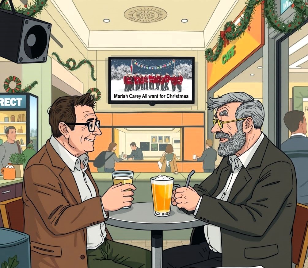 Nosotros, que ya estamos mayores, nos conformamos con un descafeinado de máquina con sacarina y una cerveza cero-cero. En el ambiente resuena a toda pastilla "Todo lo que quiero para Navidad eres tú", el famoso villancico de María Carey, o Caralla, o como se diga. Aunque le digo a Manolo que a mí el que más me gusta es "Last Christmas" de Wham y sobre todo si lo cantan en la Plaza Roja de Moscú un coro del ejército ruso con sus gorras de plato tan características. Ah, y cayendo la nieve. Le digo a mi amigo que hace unos años lo vi en el "Yutube" y me encantó la versión, y no soy el único al que le gusta, eh, que se hizo viral.