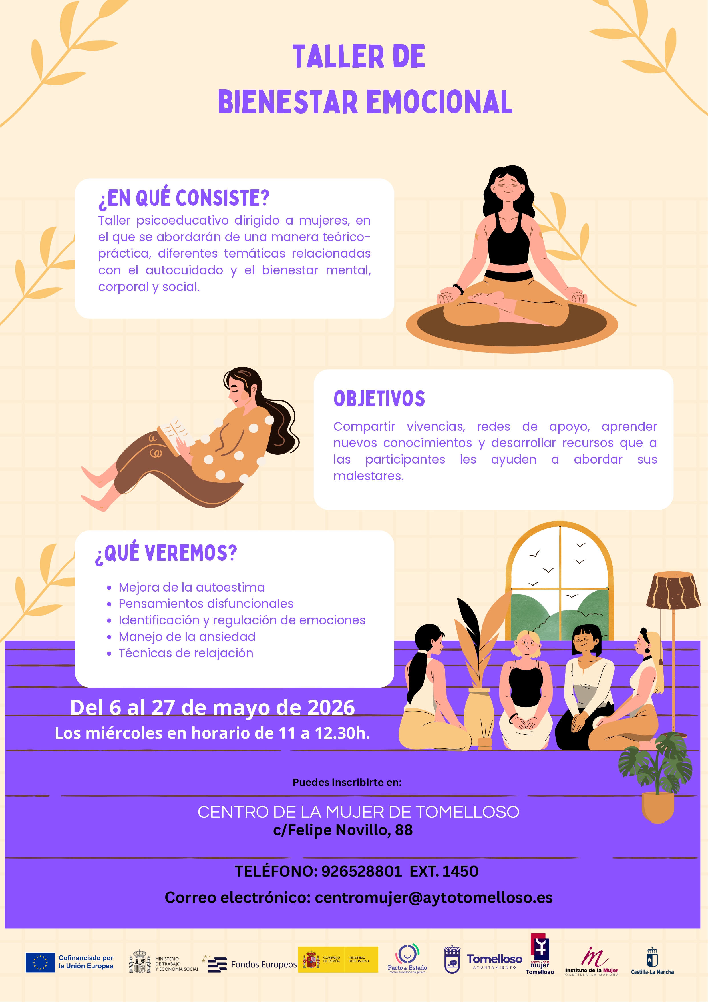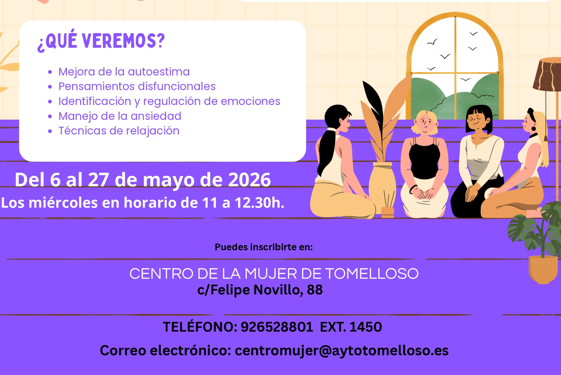 El Centro de la Mujer de Tomelloso ha organizado la actividad “Bienestar Emocional”, dirigida a mujeres, en la que se abordarán de una manera teórico-práctica, diferentes temáticas relacionadas con el autocuidado. Los objetivos de esta actividad son compartir vivencias, redes de apoyo, aprender nuevos conocimientos y desarrollar recursos que a las participantes les ayuden a abordar de una manera más positiva su día a día. Para ello se abordarán asuntos relacionados con la autoestima, pensamientos disfuncionales, regulación de emociones, manejo de ansiedad y técnicas de relajación.