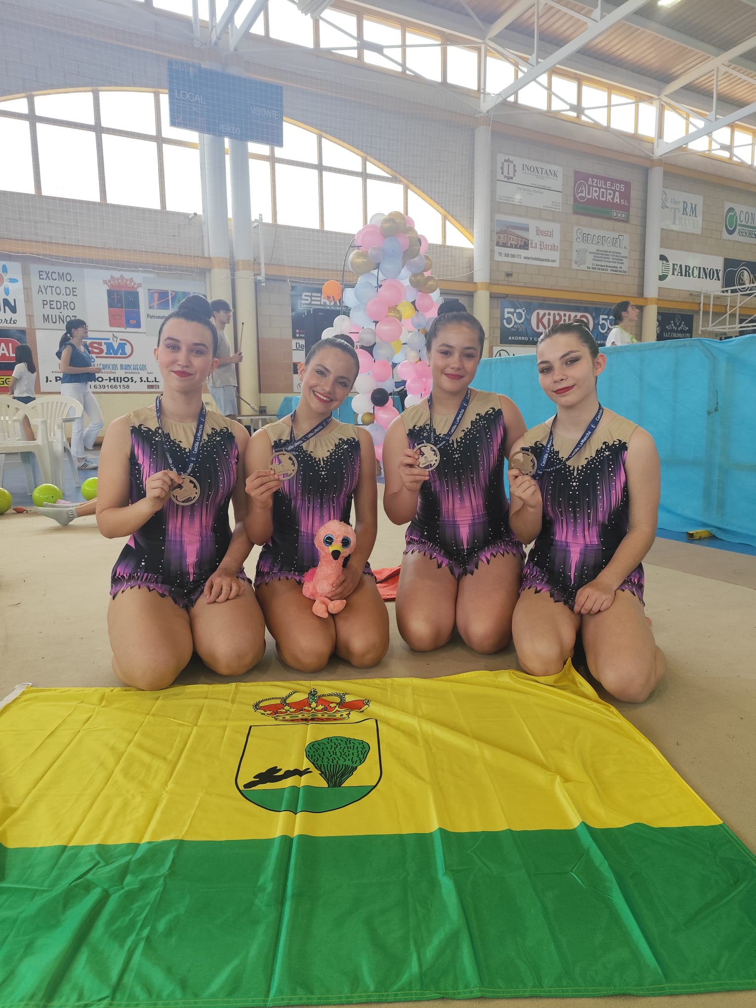 La coordinadora, Pilar Hervás, a la cabeza con el grupo de «las flamenquitas»: Alba Serna, Marta Ortiz, María Jimena y Clara Salinas han vuelto con la satisfacción de terminar la temporada con el mejor sabor de boca que pudiese tener la escuela, pódium en el primer campeonato regional de gimnasia rítmica escolar para la ciudad de Tomelloso.