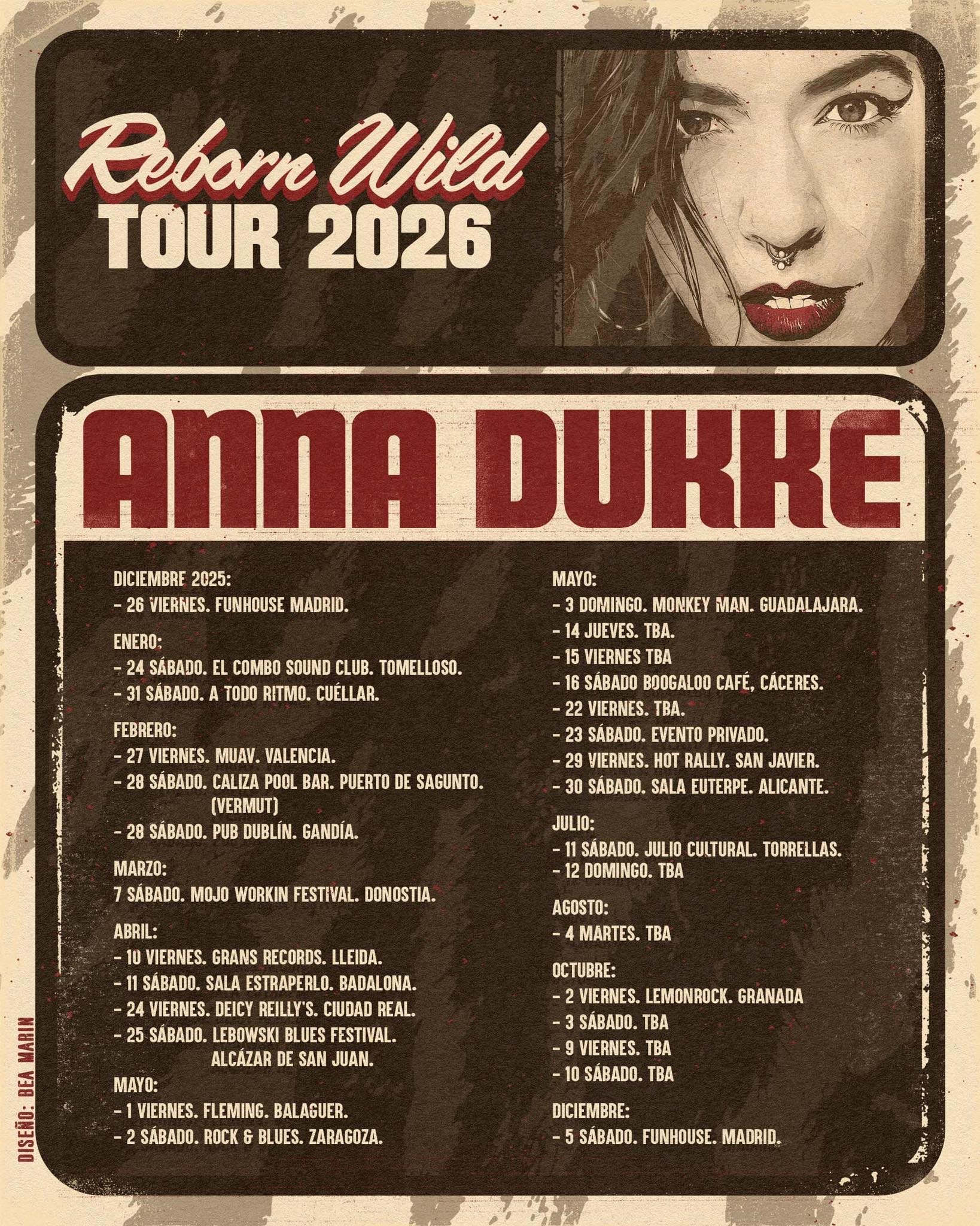 La cantante y compositora Anna Dukke pone en marcha el “Reborn Wild Tour” y por fin comparte las primeras fechas confirmadas de una gira que promete ir creciendo en las próximas semanas. En el cartel ya aparecen algunas ciudades como TBA: conciertos que están cerrados, pero que no se pueden anunciar oficialmente hasta recibir luz verde por parte de los promotores.