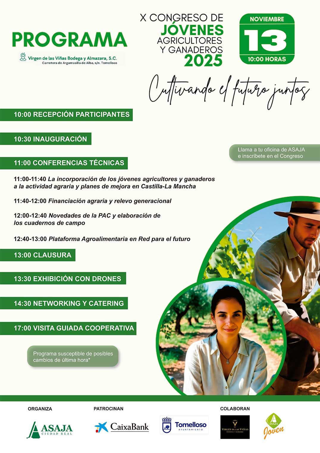 El encuentro, patrocinado por CaixaBank y el Ayuntamiento de Tomelloso, contará con la participación de representantes institucionales, empresas del sector y jóvenes profesionales procedentes de toda la provincia. La recepción de los participantes tendrá lugar a las 10:00 y el acto comenzará a las 10:30 horas, con la inauguración del alcalde de Tomelloso, Javier Navarro; la bienvenida del presidente de Virgen de las Viñas, Rafael Torres; el saludo del Director AgroBank de Castilla-La Mancha y Extremadura, Pedro Antonio Martínez, y las intervenciones de la viceconsejera PAC, Mariana de Gracia Canales; y del presidente de ASAJA, Pedro Barato.