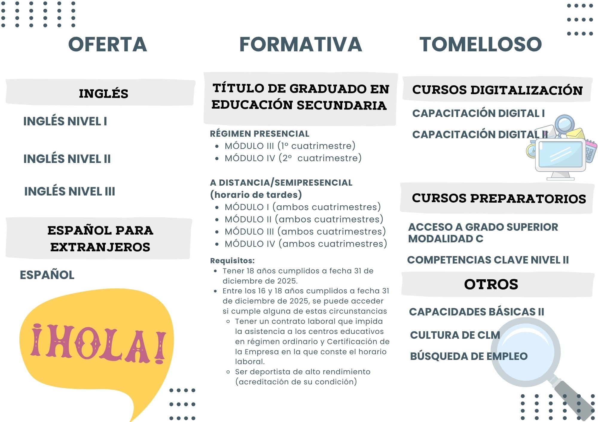 - Enseñanzas No formales: Capacidades Básicas II, Cultura de Castilla-La Mancha y Búsqueda de Empleo.