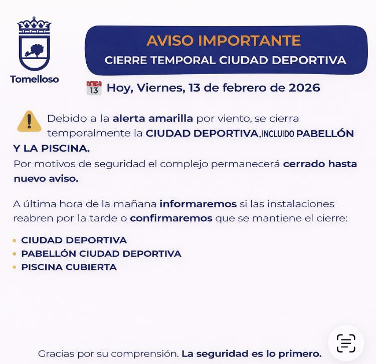 En cumplimiento de las medidas de seguridad y debido a la alerta amarilla por viento emitida por la Agencia Estatal de Meteorología, el Complejo Deportivo de Tomelloso, que incluye el Pabellón y la Piscina cubierta, permanecerá cerrado de manera temporal hasta nuevo aviso.