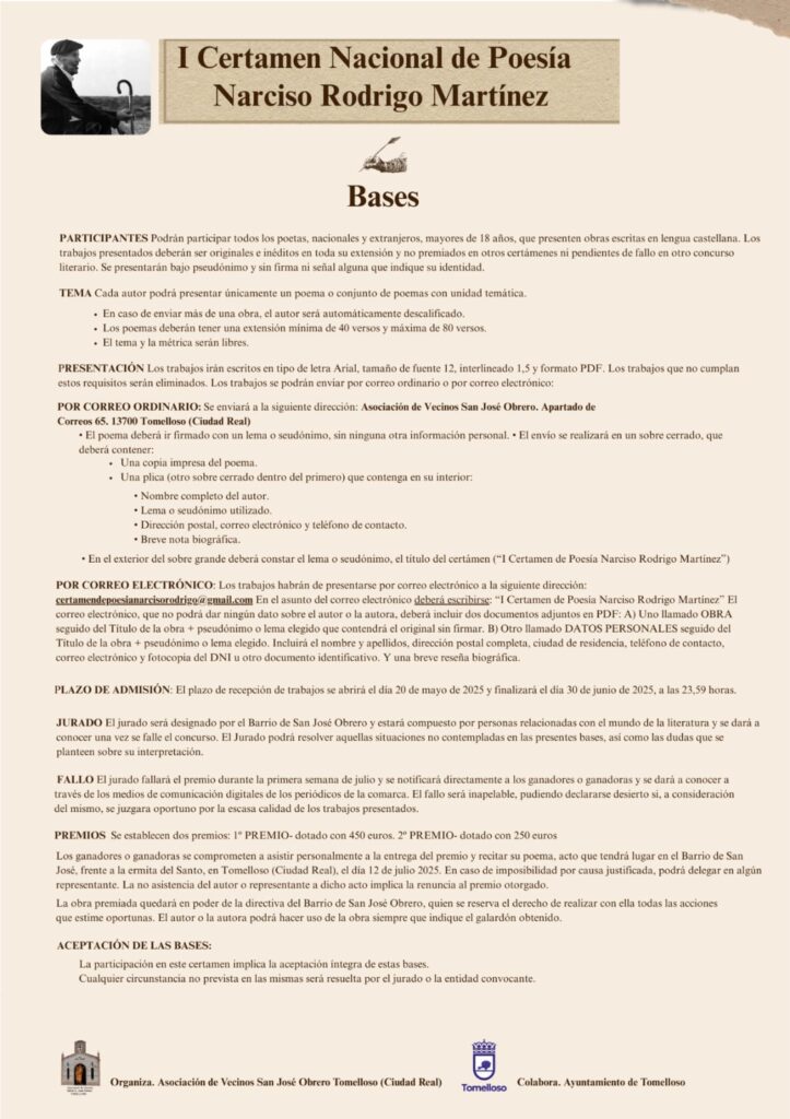 Hoy por tanto se ha convocado este certamen de poesía a nivel nacional y con él, no solo se reconocerá la figura de Narciso rodrigo, sino que además se podrá llevar a través de la poesía la historia del barrio de San José Obrero al lado más tierno y fraternal de la belleza y de esa lucha que llevaron a cabo todos los vecinos, no solo con la creación del barrio sino con la comunidad formada por ellos mismos para fortalecer las relaciones.