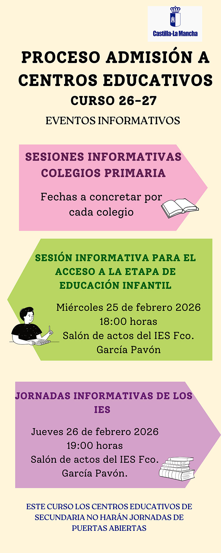 - El miércoles 25 de febrero a las 18:00 en el salón de actos del IES Francisco García Pavón tendrá lugar una charla informativa para las familias de aquellos niños/as que el próximo curso inician la etapa de Educación Infantil. En dicha charla podrán encontrar información sobre el proceso de admisión y las características de la nueva etapa educativa.