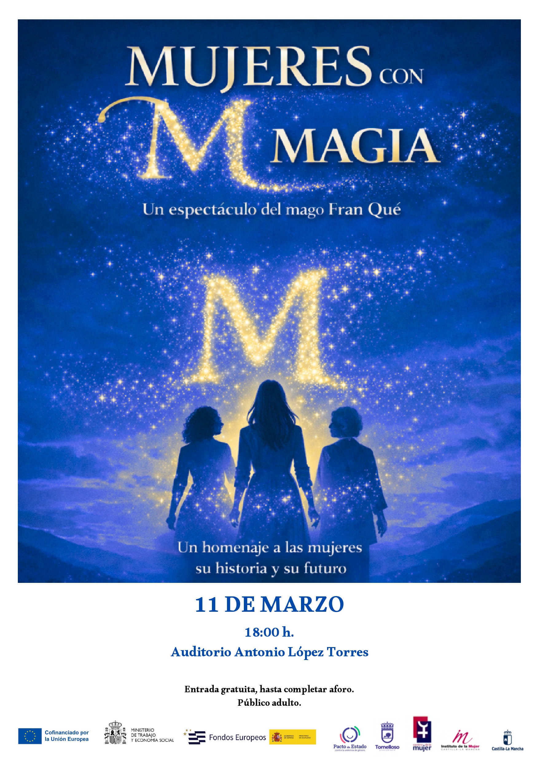 Dentro de las actividades programadas con motivo del 8 de marzo, Día Internacional de las Mujeres, tendrá lugar el próximo miércoles, día 11, en el Auditorio López Torres, a las 18h, el espectáculo “MUJERES CON DE MAGIA”, del mago Fran Qué. Una propuesta dirigida a público adulto, que pone el foco en las mujeres que han cambiado el mundo y en aquellas que lo sostienen cada día, aunque muchas veces no aparezcan en los libros de historia. La entrada es gratuita hasta completar aforo
