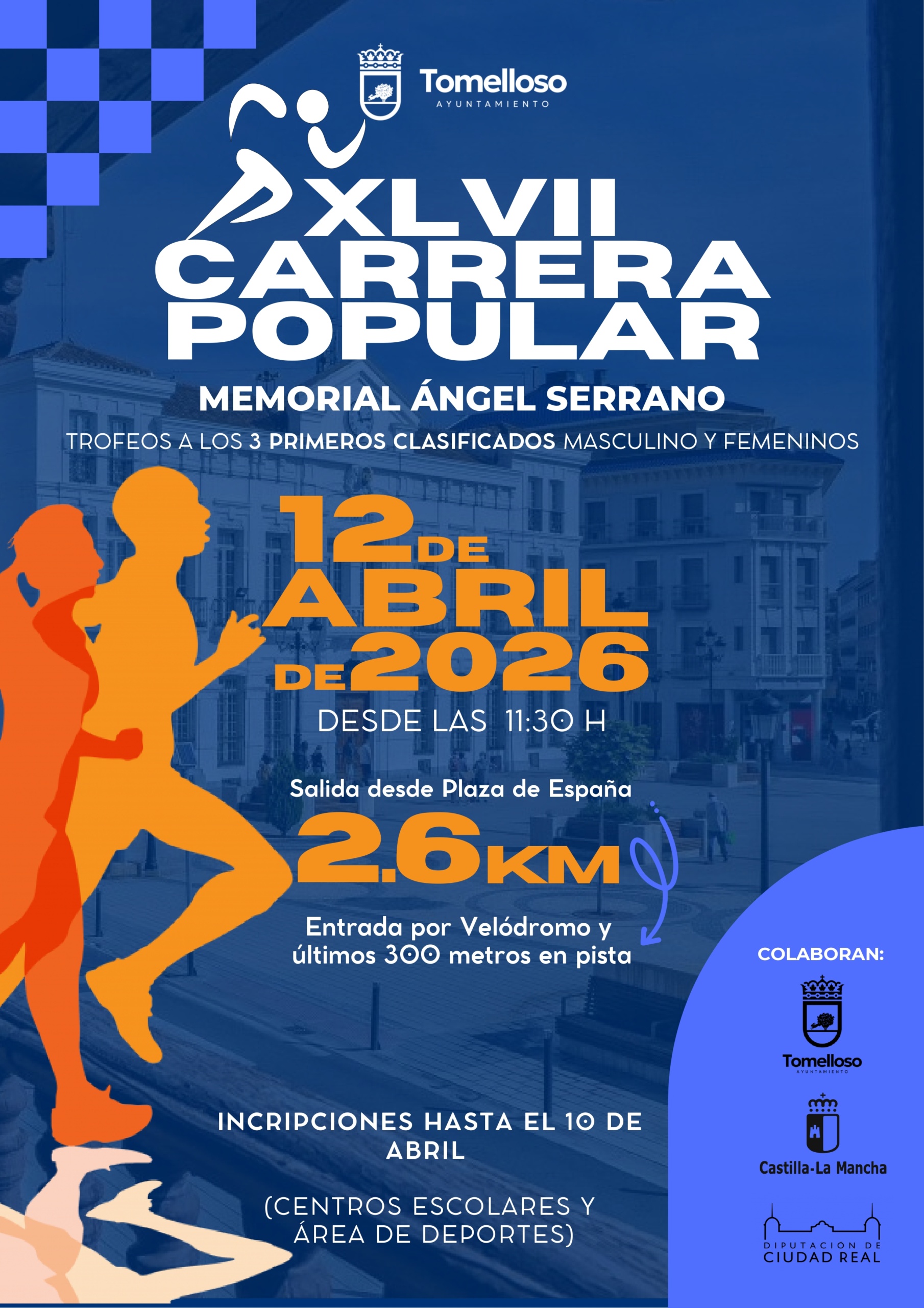 Este domingo 12 de abril, a las 11:30 h, Tomelloso volverá a citarse con el deporte y la tradición con la 47ª edición de la Carrera Popular “Memorial Ángel Serrano”, organizada por el Ayuntamiento de Tomelloso, a través del Área Municipal de Deportes. La salida tendrá lugar en la Plaza de España, y la meta estará situada en la Pista de Atletismo de la Ciudad Deportiva, completando un recorrido de 2,6 kilómetros.