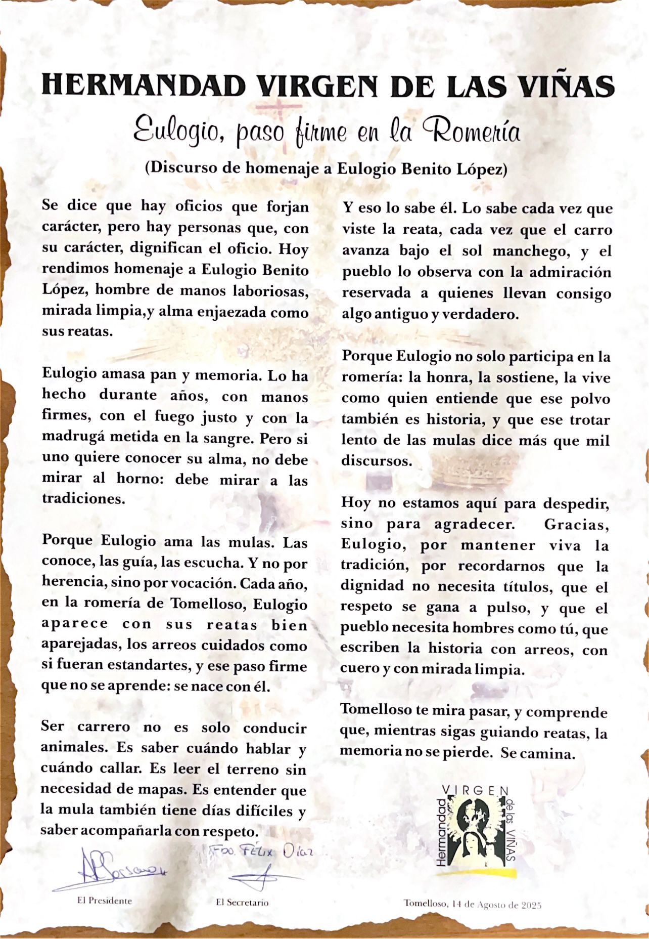 En el acto del Día del Hermano ya se ensalzó su recorrido con el discurso de homenaje de Félix Díaz bajo el título: “Eulogio, paso firme en la Romería”, donde se le describía como una persona que “amasa pan y memoria”, “hombre de manos laboriosas, mirada limpia y alma enjaezada como sus reatas”.