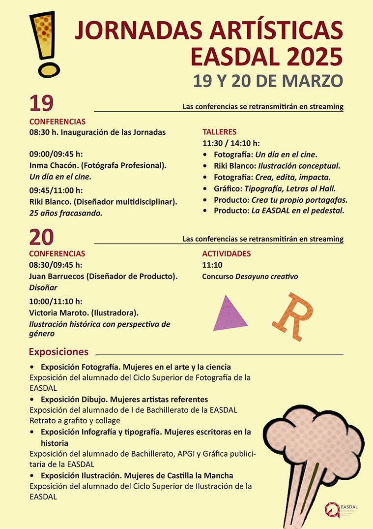Las Jornadas Creativas EASDAL están enfocadas para crear un espacio multidisciplinar en el que todo el alumnado, independientemente del nivel formativo en el que se encuentra estudiando este curso, pueda empezar a plantearse su futuro profesional a través de la formación que va a recibir con las ponencias de los profesionales y los talleres creativos que cada uno podrá elegir según sus motivaciones e inquietudes. Los talleres se desarrollarán para la experimentación creativa desde la fotografía, la tipografía, el diseño de producto, el diseño gráfico y la animación.