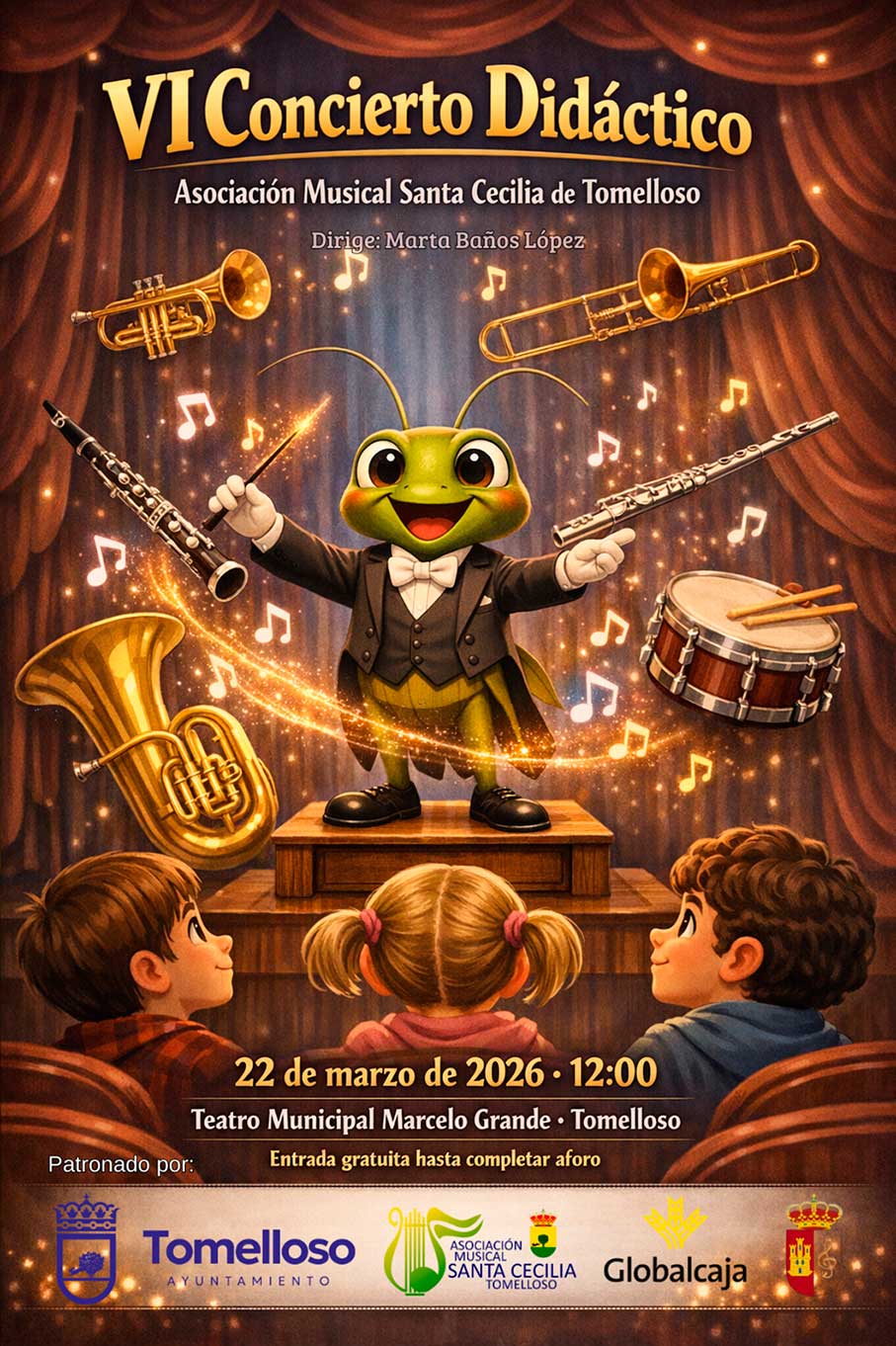 La música y la imaginación volverán a encontrarse en Tomelloso el próximo 22 de marzo a las 12:00 horas en el Teatro Municipal Marcelo Grande, que acogerá el VI Concierto Didáctico organizado por la Asociación Musical Santa Cecilia de Tomelloso. La cita, dirigida al público infantil y familiar, ofrecerá una propuesta escénica distinta, cercana y muy visual, pensada para despertar la curiosidad de los más pequeños a través del sonido, los cuentos y la emoción.