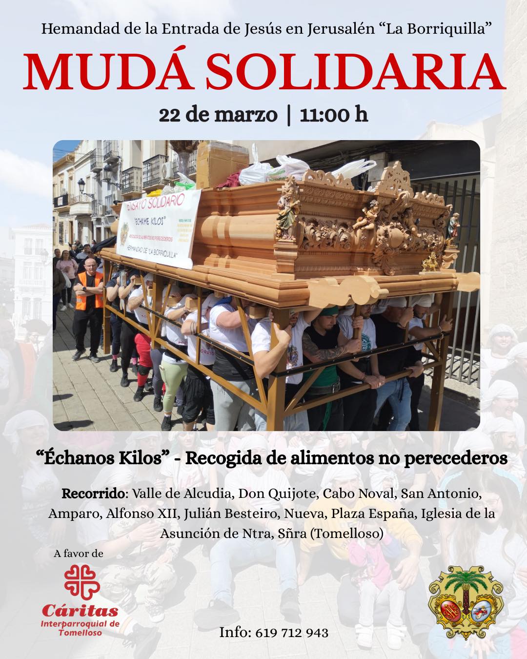 La Hermandad de la Entrada de Jesús en Jerusalén “La Borriquilla” de Tomelloso celebrará este próximo 22 de marzo, a partir de las 11:00 horas, una nueva edición de su ya tradicional mudá solidaria, una convocatoria que une el pulso de la Cuaresma, la preparación del Domingo de Ramos y el compromiso real con quienes más lo necesitan.