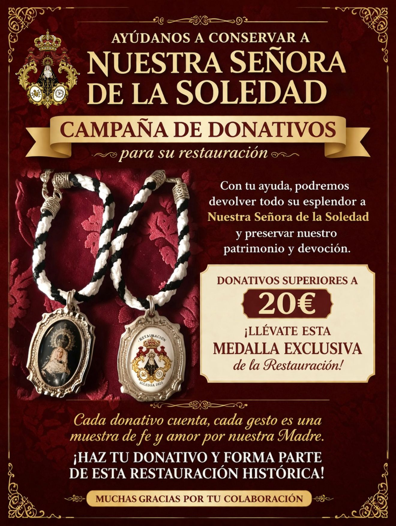 Con esta iniciativa, la Hermandad da un paso más en su objetivo de reunir apoyo económico para sufragar los gastos derivados de la restauración. Según se informa, con un donativo igual o superior a 20 euros los asistentes podrán colaborar con esta causa, en una fórmula que combina devoción y compromiso con la conservación de la imagen. Como explica la propia organización, se busca conseguir “donativos para sufragar el gasto que conlleva la restauración”, apelando a la sensibilidad de quienes mantienen un vínculo especial con la Virgen de la Soledad.