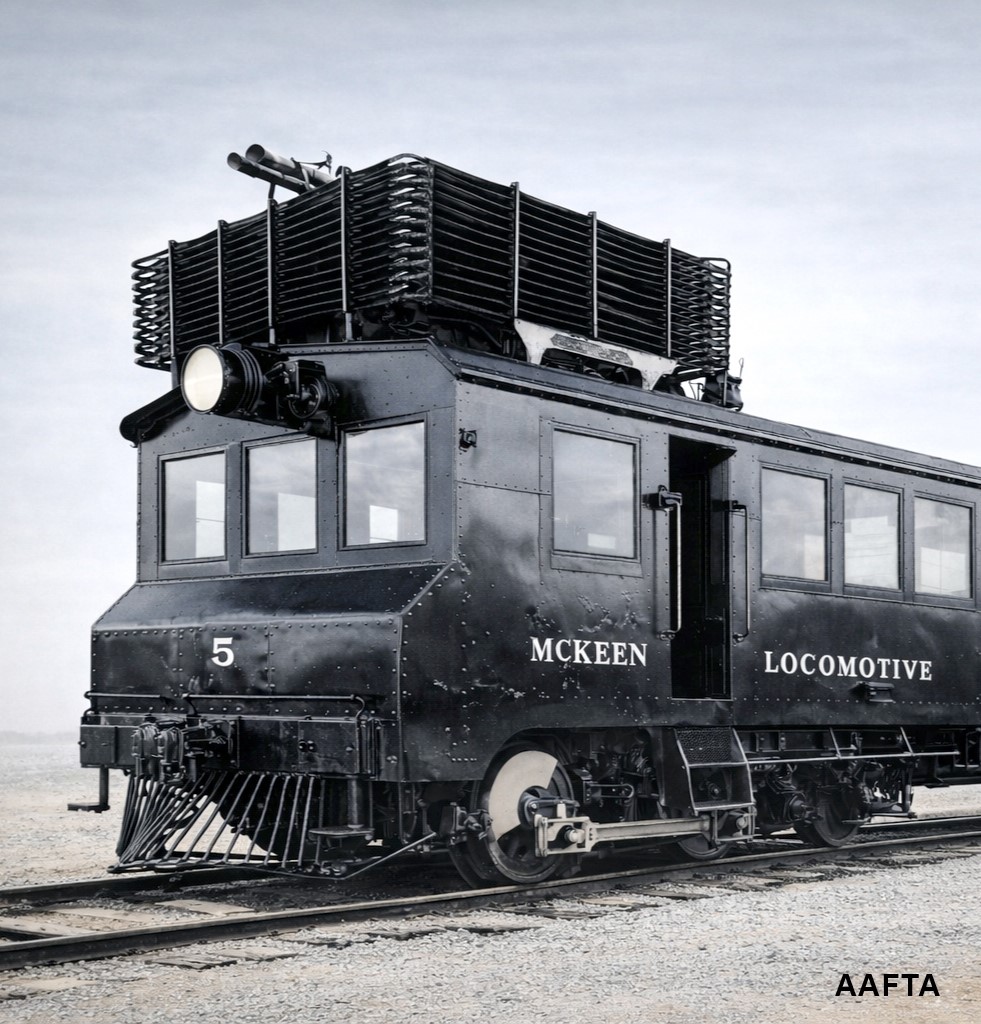 La segunda máquina en llegar fue una McKeen, construida en Omaha (Nebraska, EEUU) entre 1905 y 1916. A principios del siglo XX Nebraska era uno de los grandes nudos ferroviarios del Medio Oeste, allí tenía su sede la poderosa Union Pacific y en ese entorno industrial surgió la McKeen Motor Car Company. La locomotora McKeen llegó a Tomelloso principalmente para remolcar mercancías y realizar maniobras en la propia estación. Este hecho fue notable ya que ambas locomotoras, la Cummings y la McKeen, fueron las primeras máquinas de gasolina en vía ancha en España en una época en el que el vapor dominaba por completo. Era algo innovador y marcaron una fase temprana de tracción mecánica en la red ferroviaria española, mucho antes de la implantación generalizada de locomotoras diesel en la década de 1960. La locomotora McKeen llegó también al puerto de Cádiz en el barco Cabo de Creus procedente de Nueva York, siendo recibida por el Director del ferrocarril Francisco Martínez y remolcada por un tren de MZA hasta la línea de Tomelloso.