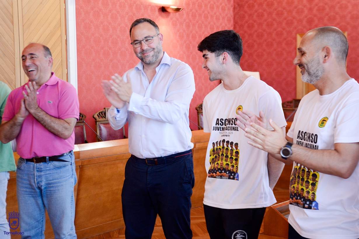 El Ayuntamiento de Tomelloso acogió en la tarde de ayer una emotiva recepción en honor al equipo juvenil de fútbol de la ciudad, tras lograr su ascenso a Liga Nacional. El acto, presidido por el alcalde Javier Navarro, contó con la presencia del presidente del Atlético Tomelloso, Jorge Romero, concejales del equipo de gobierno, plantilla completa de jugadores, directivos, cuerpo técnico y familiares, quienes celebraron juntos este importante hito deportivo.