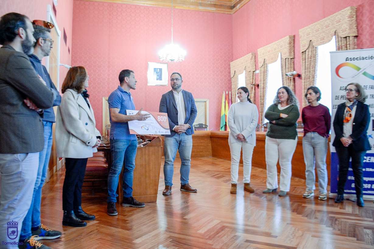 En presencia del alcalde de la ciudad, Javier Navarro y del concejal de Deporte, Benjamín de Sebastián, el Club Amigos del Atletismo Pieles Run entregó a la asociación TEAcompaño C-LM la donación conseguida tras la celebración de la pasada San Silvestre Tomellosera 2025. Han sido 800 € procedente de una parte de las inscripciones y de lo conseguido a través de la fila cero. En el salón de plenos del Ayuntamiento, Alejandro Sola, del club de atletismo entregó el simbólico cheque a la representante de esta asociación, Cortes Jiménez, un acto que también contó con la presencia de Montse Castellanos, en representación del patrocinador principal de la carrera, el Grupo Surco.