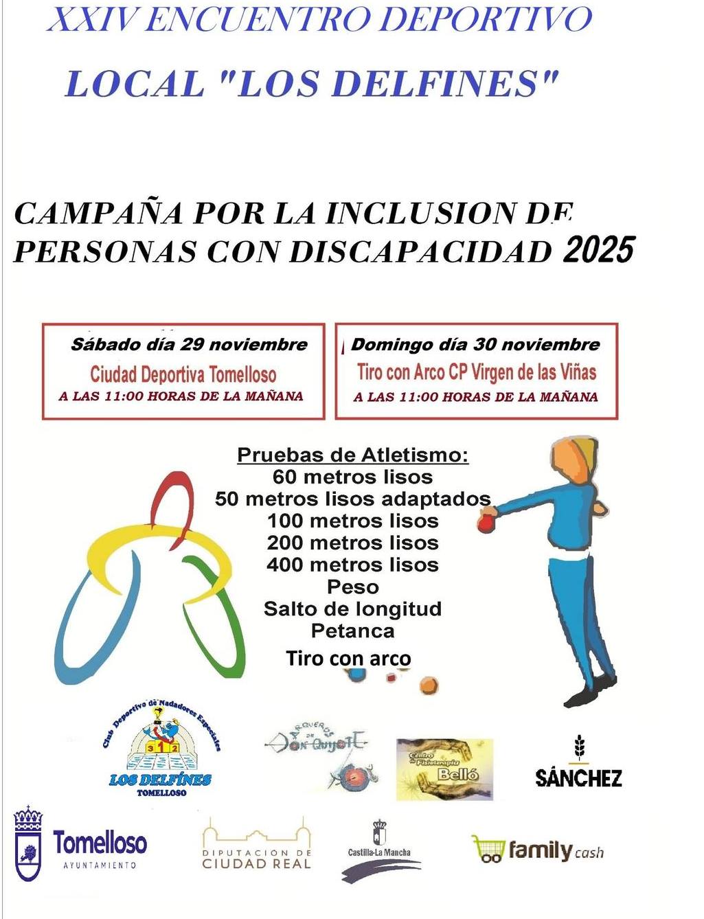 El Ayuntamiento de Tomelloso ha anunciado un año más, el XXIV Encuentro Deportivo Local “Los Delfines”, un evento que se ha consolidado como uno de los referentes en la promoción de la inclusión, la igualdad y la participación a través del deporte. Este encuentro se llevará a cabo el sábado 29 y domingo 30 de noviembre de 2025 en la Ciudad Deportiva Tomelloso y el CP Virgen de las Viñas, comenzando a las 11:00 horas en ambos días.