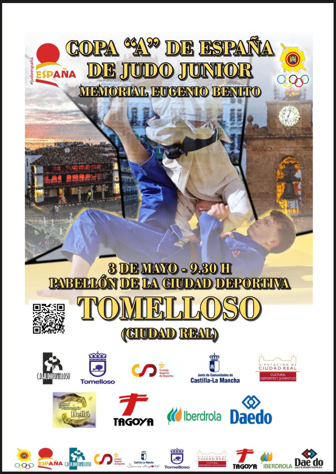 El pabellón de la Ciudad Deportiva de Tomelloso acogerá esta sábado 3 de mayo la Copa de España de Judo Junior “Memorial Eugenio Benito”. Será la segunda vez consecutiva que la ciudad albergue este importante evento que concentrará a entre 200 y 300 participantes de España y Portugal. Han presentado esta mañana la competición el alcalde de la ciudad, Javier Navarro; el concejal de Deportes, Benjamín de Sebastián y el presidente del club de Judo Tomelloso, Alberto Gabarro.