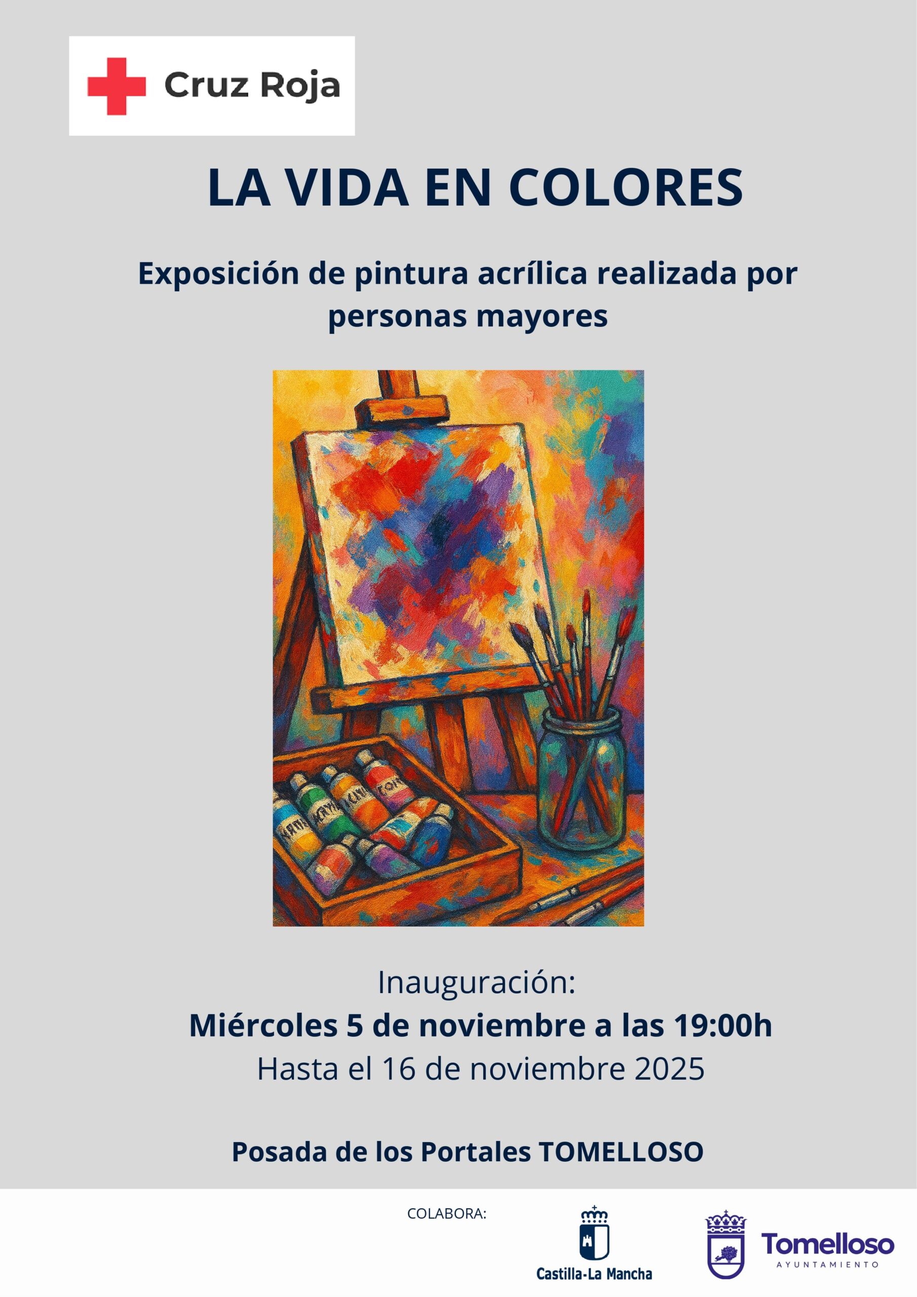 La Posada de los Portales acoge del 5 al 16 de noviembre de 2025 una exposición de pintura acrílica realizada por un grupo de mujeres mayores que participan en un taller organizado por Cruz Roja y coordinado por la pintora tomellosera Manoli Jiménez. La inauguración tendrá lugar el miércoles 5 a las 19:00 h.