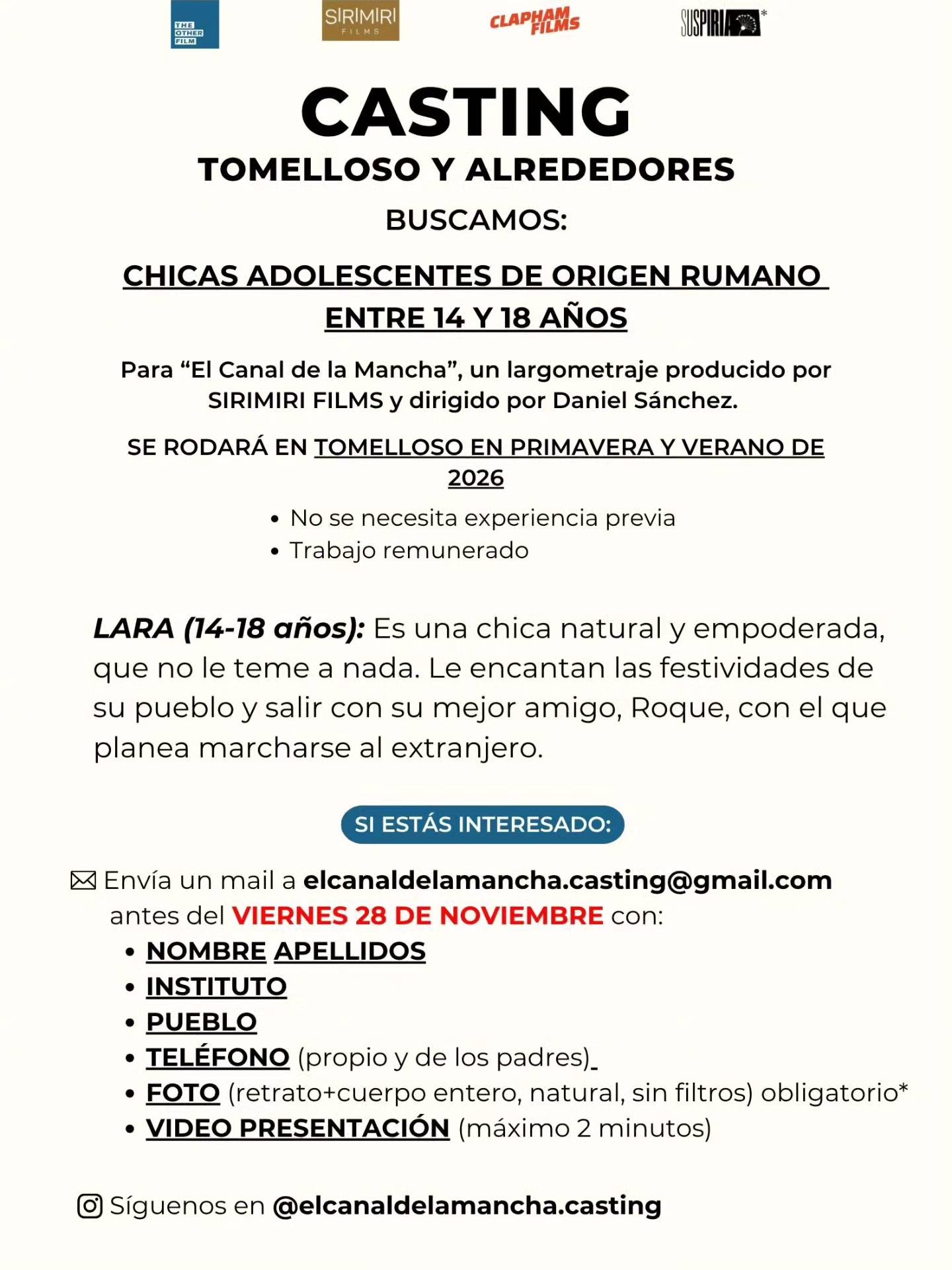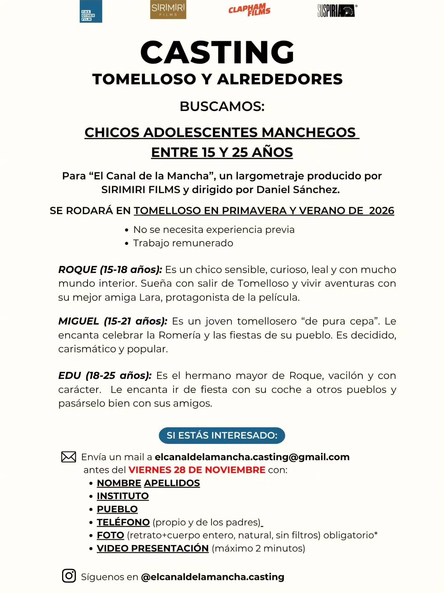 El proyecto no solo ofrece una gran oportunidad para los jóvenes actores de Tomelloso, sino que también se remunerará el trabajo de los seleccionados. Aquellos interesados en participar deberán enviar un correo electrónico a la dirección que aparece en los carteles informativos. El casting se llevará a cabo próximamente, y se informará a los candidatos sobre el lugar, día y hora de la prueba.